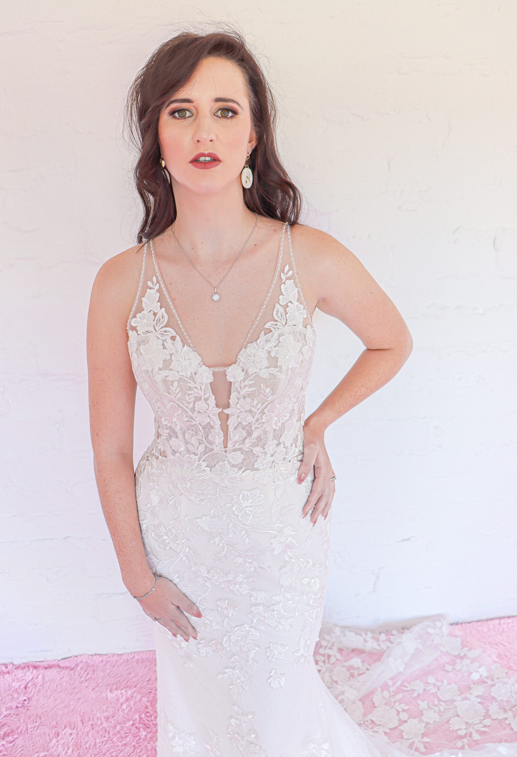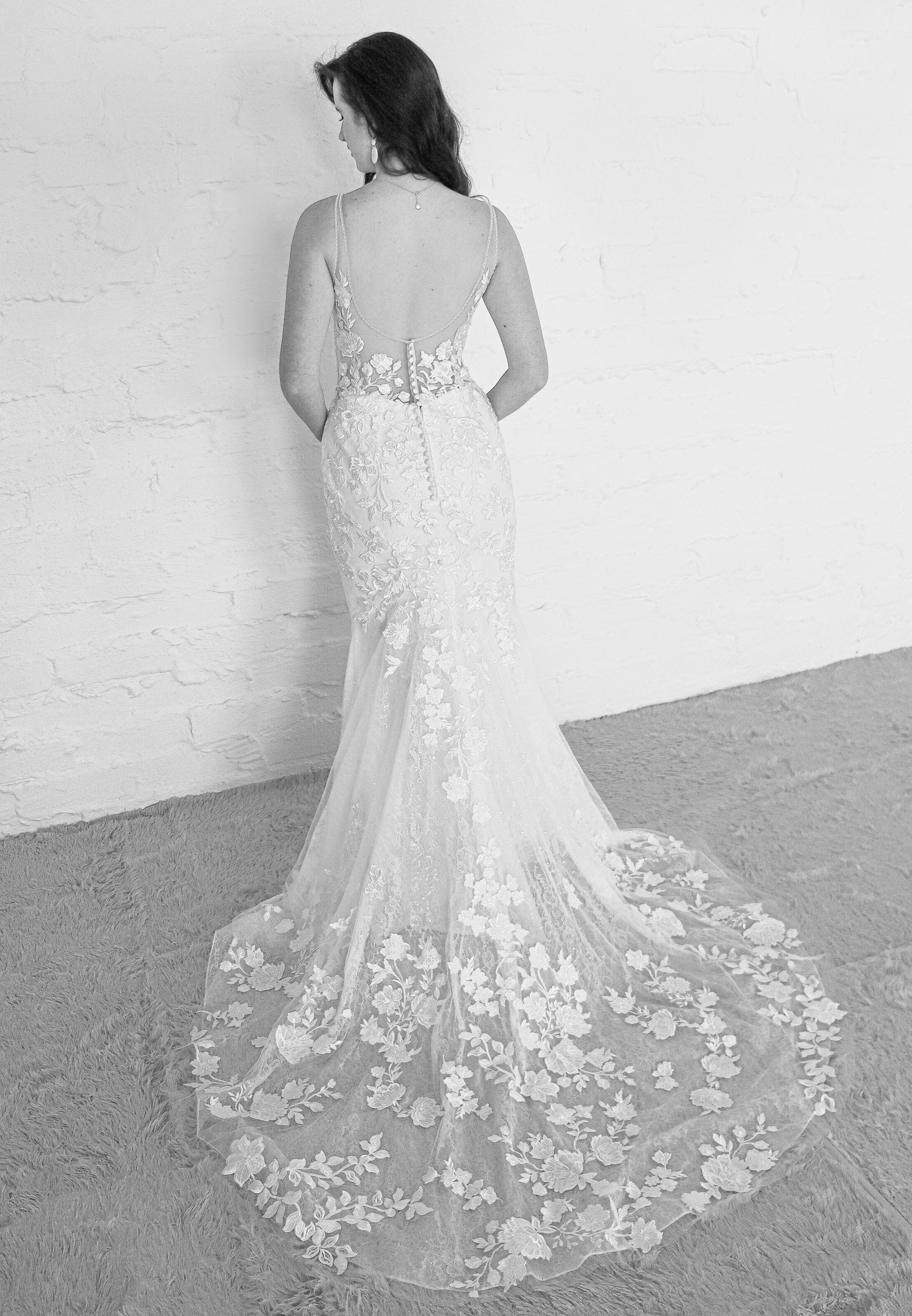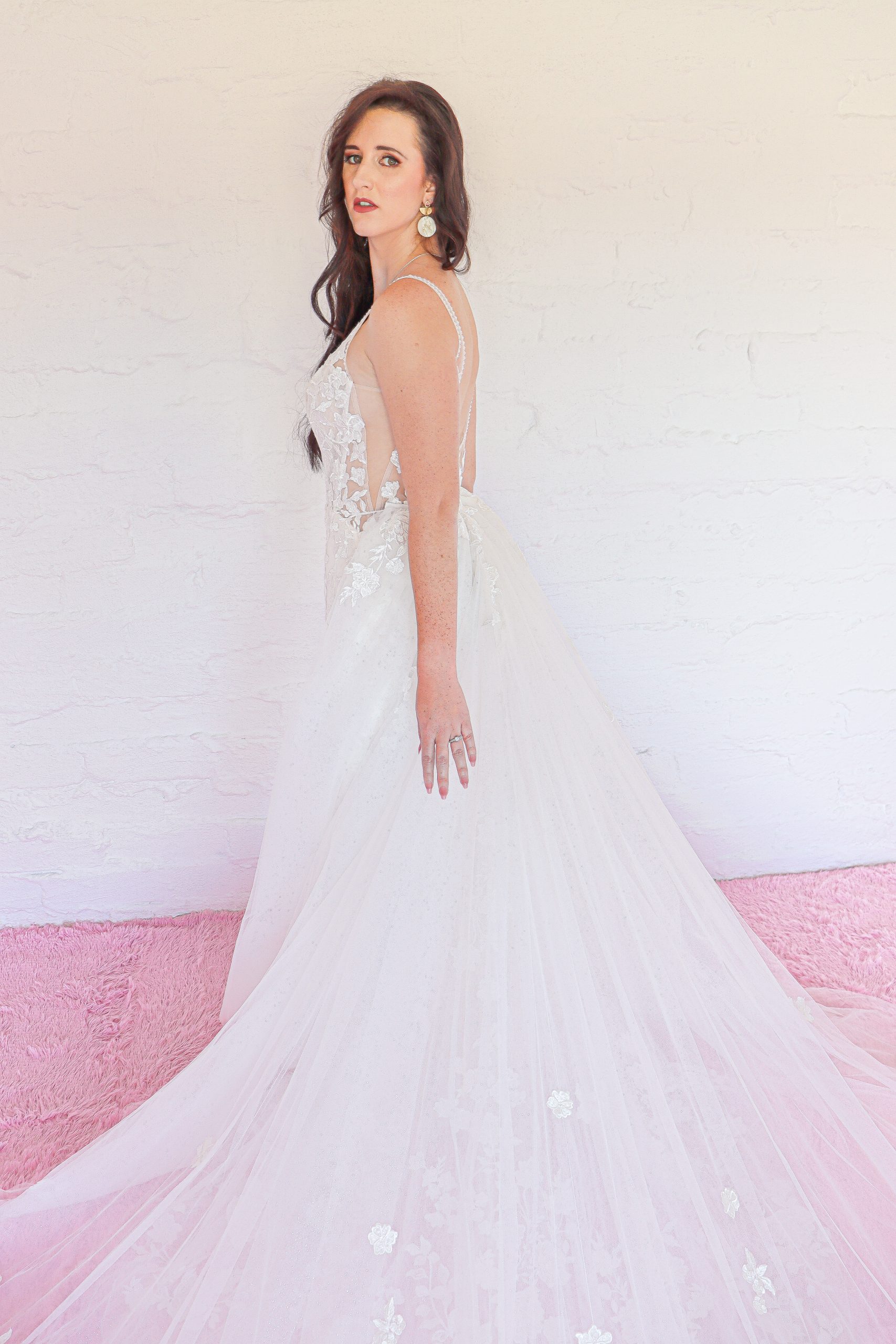 Stylish and dazzling with a fit-and-flare silhouette beneath a sparkling detachable lace skirt. Her plunging neckline and open side panels are chicly edged with crystal beading with a scooped illusion back. Her train is exquisitely crafted with floral embroidery to flow in harmony with her sparkly detachable skirt, the ultimate two looks in one.
