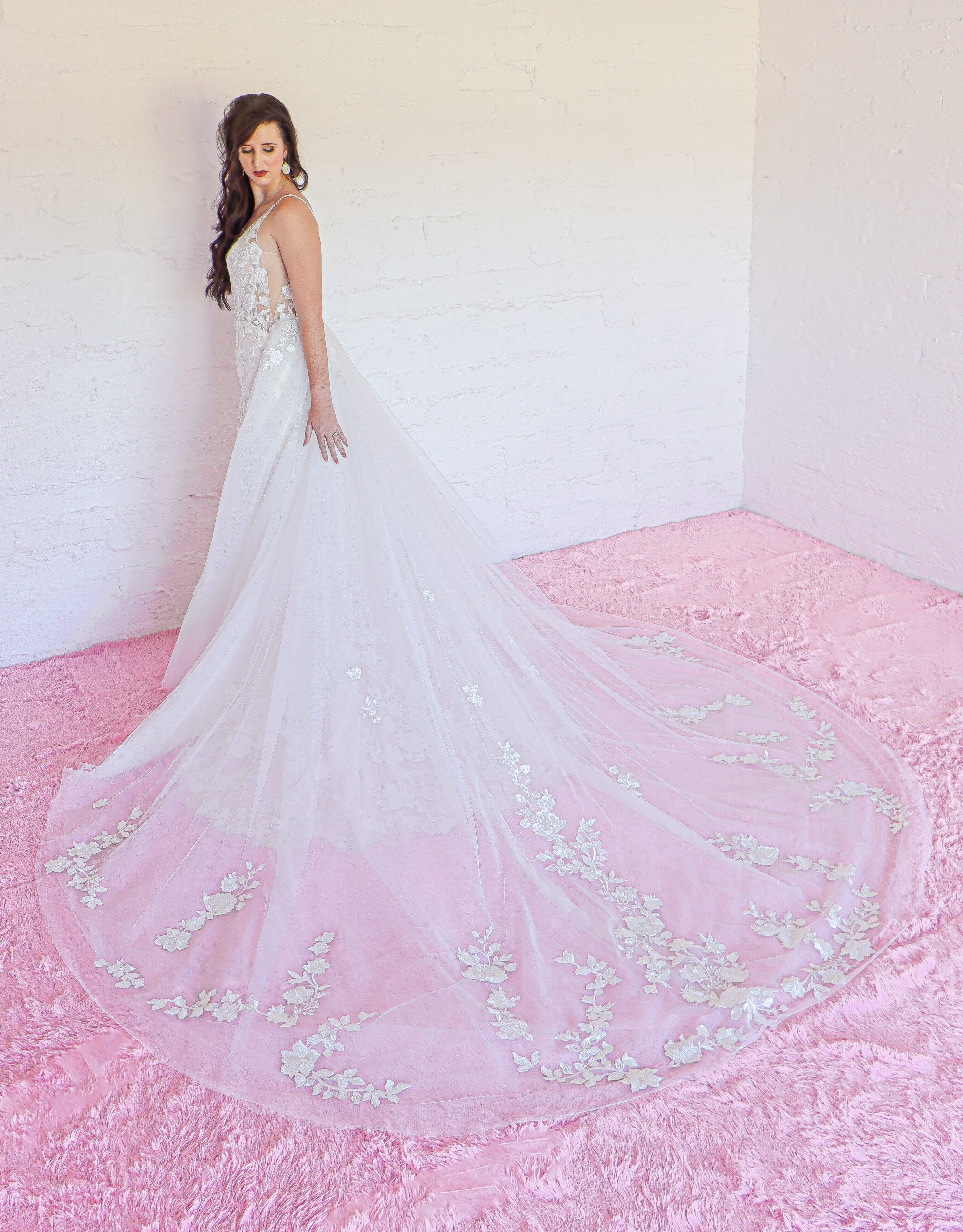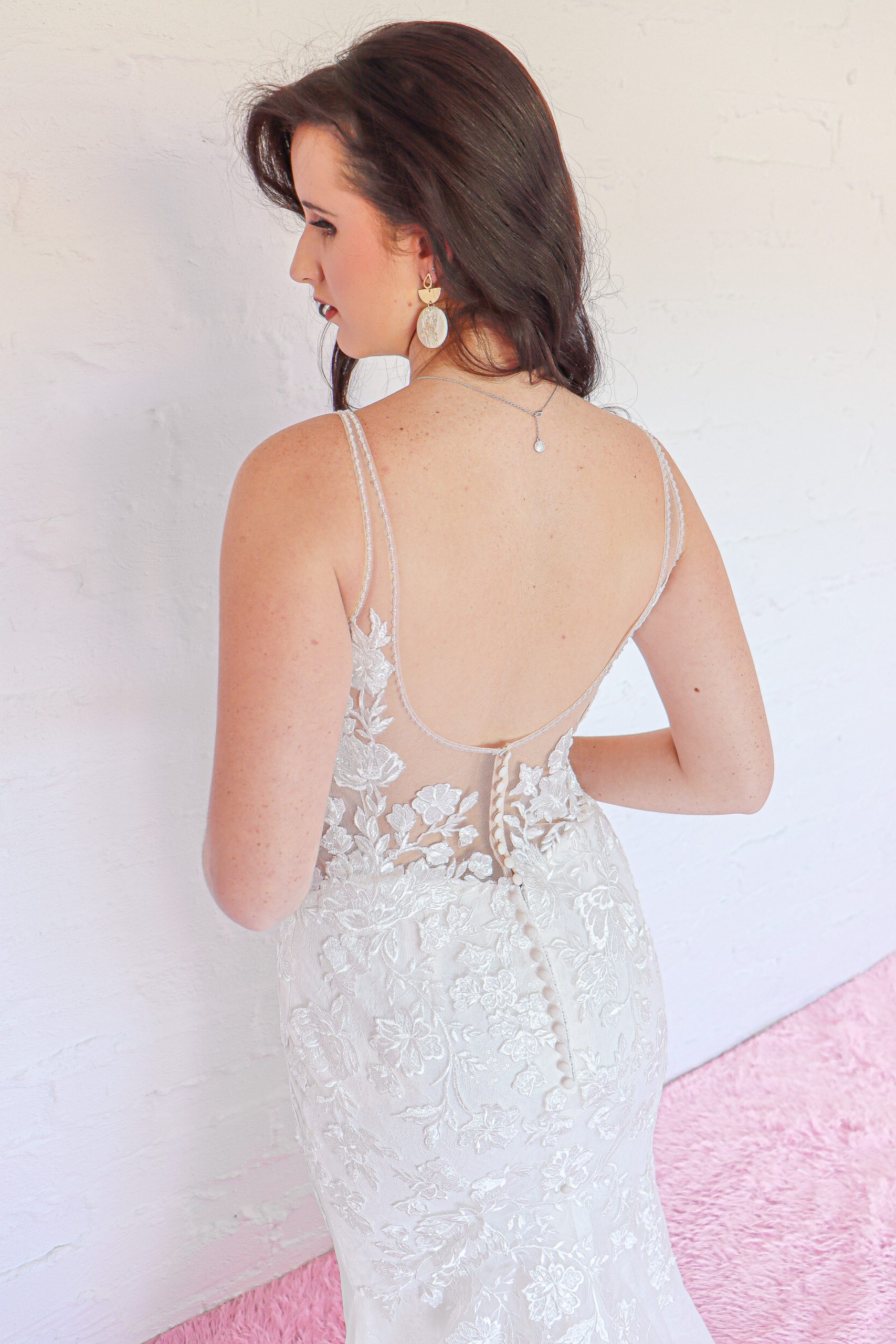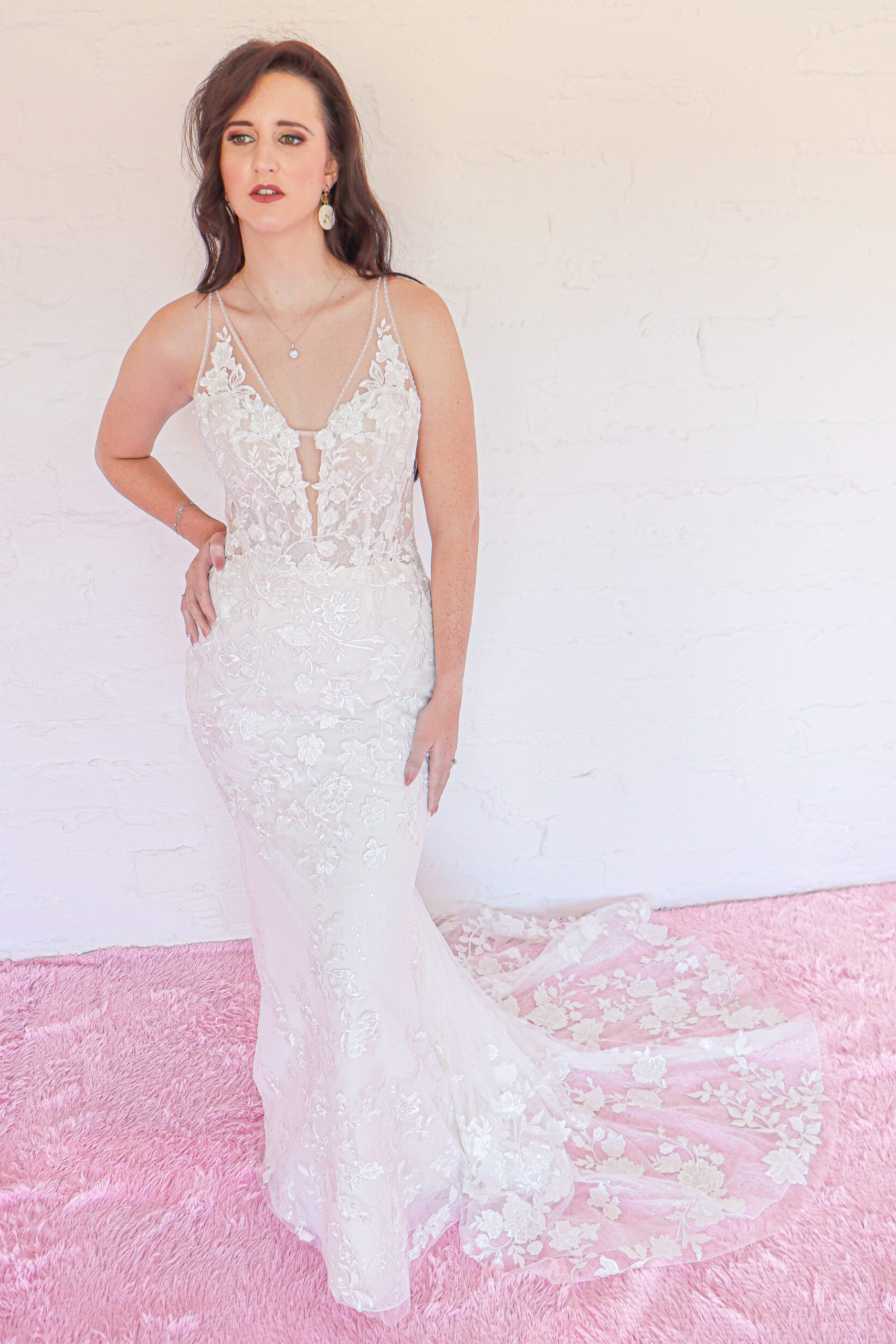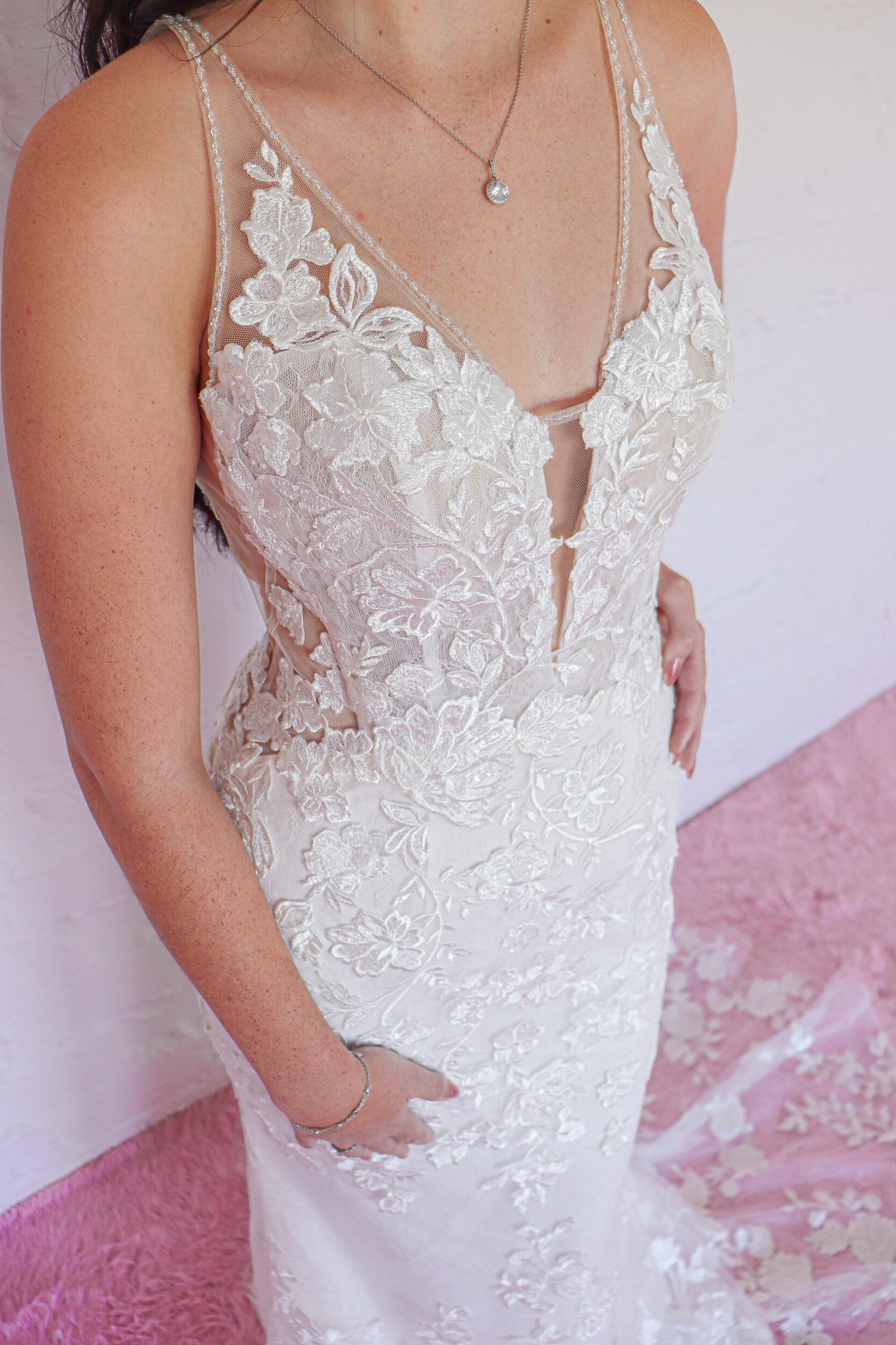 Stylish and dazzling with a fit-and-flare silhouette beneath a sparkling detachable lace skirt. Her plunging neckline and open side panels are chicly edged with crystal beading with a scooped illusion back. Her train is exquisitely crafted with floral embroidery to flow in harmony with her sparkly detachable skirt, the ultimate two looks in one.