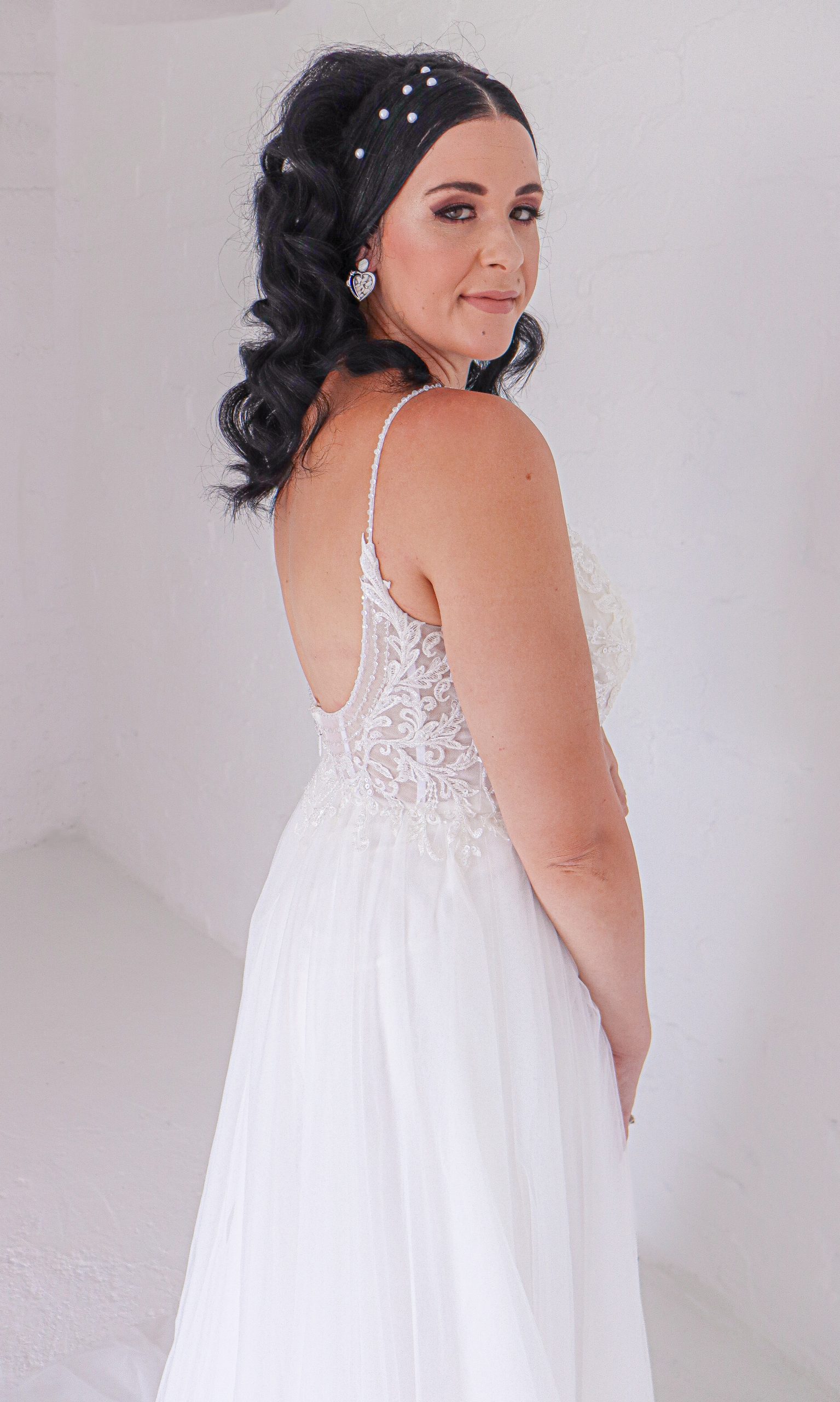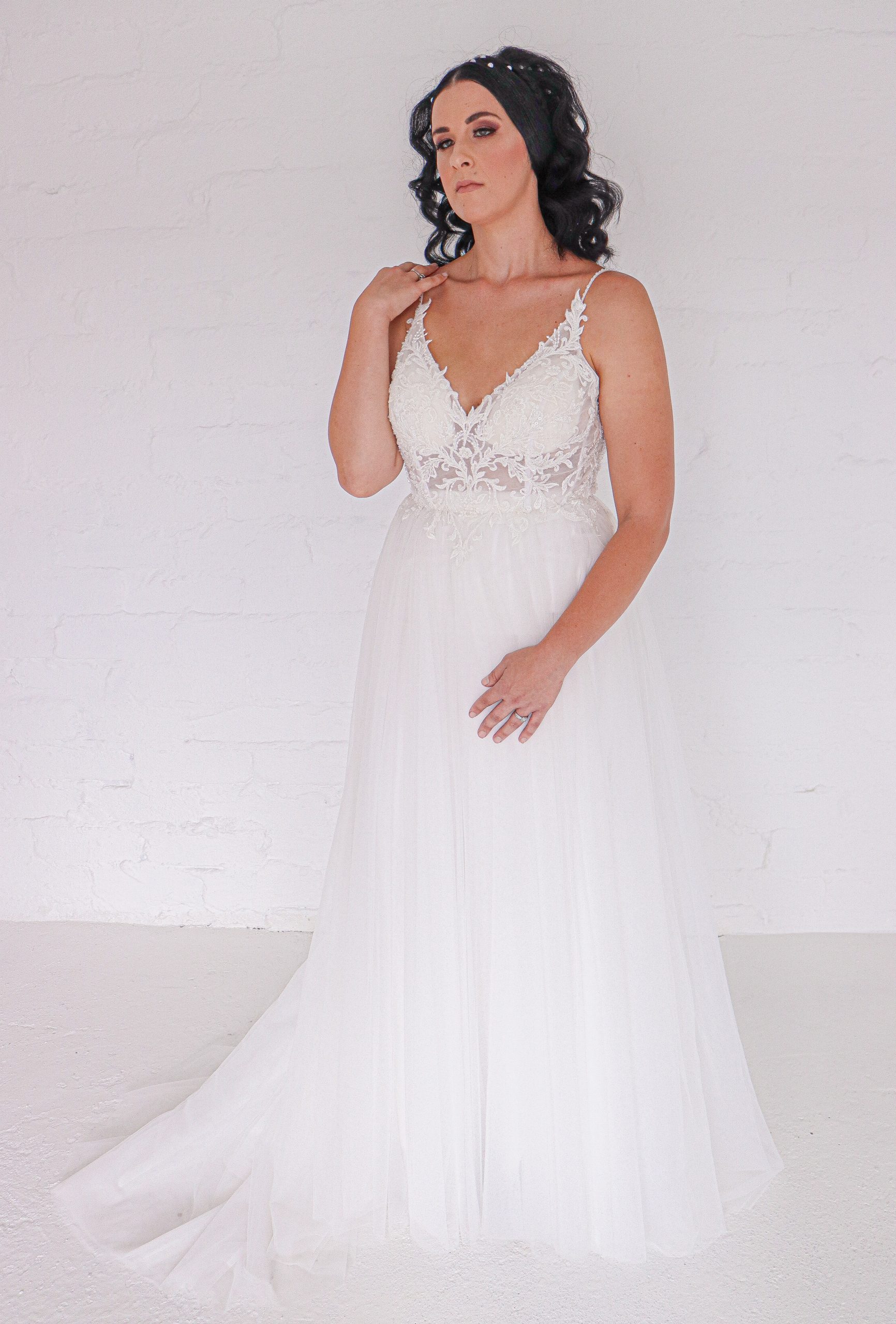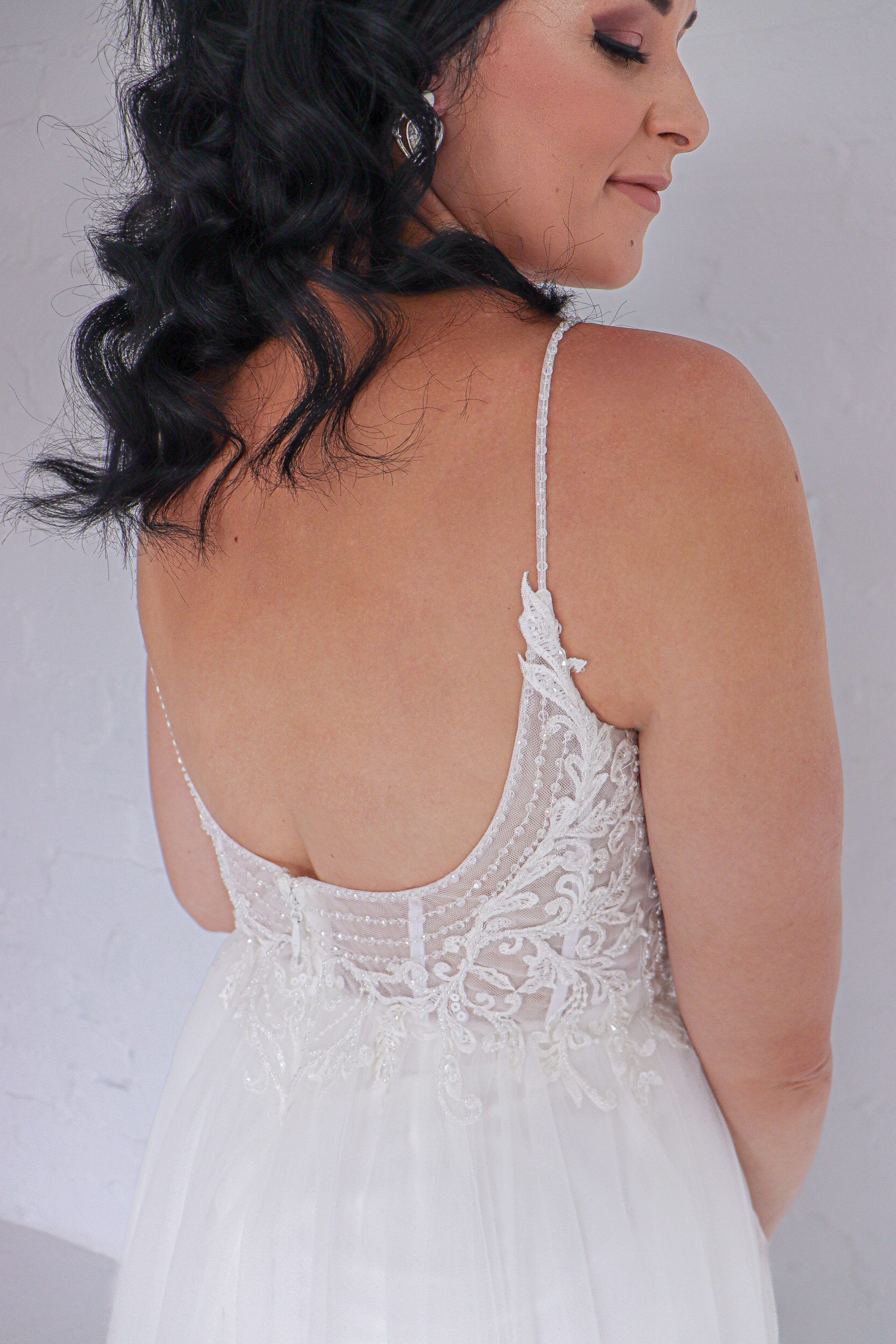 A soft and delicate A-Line with laced bodice and flowy tulle skirt. Her elegant V-neckline is adjoined with thinly beaded straps, trickling into a scooped low back; precisely lined with beaded patterns.