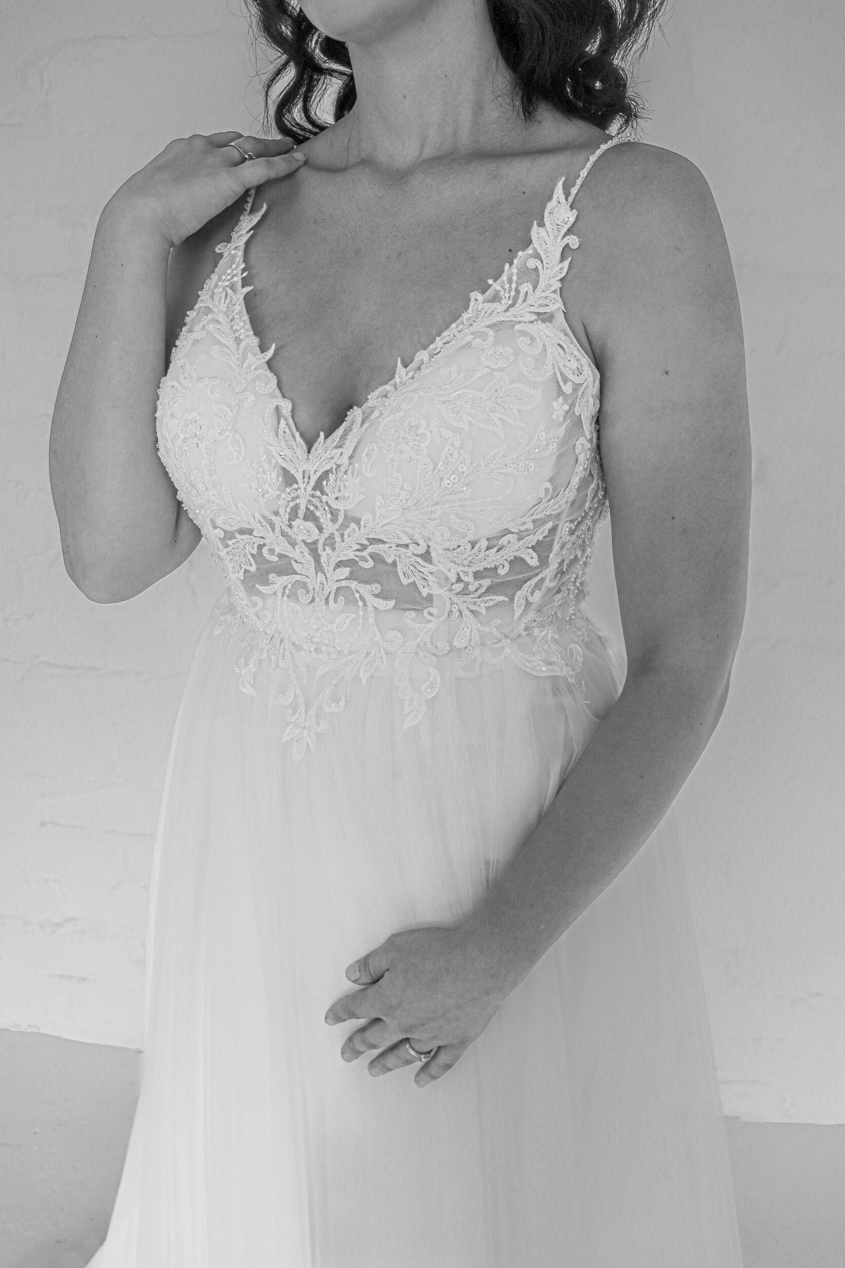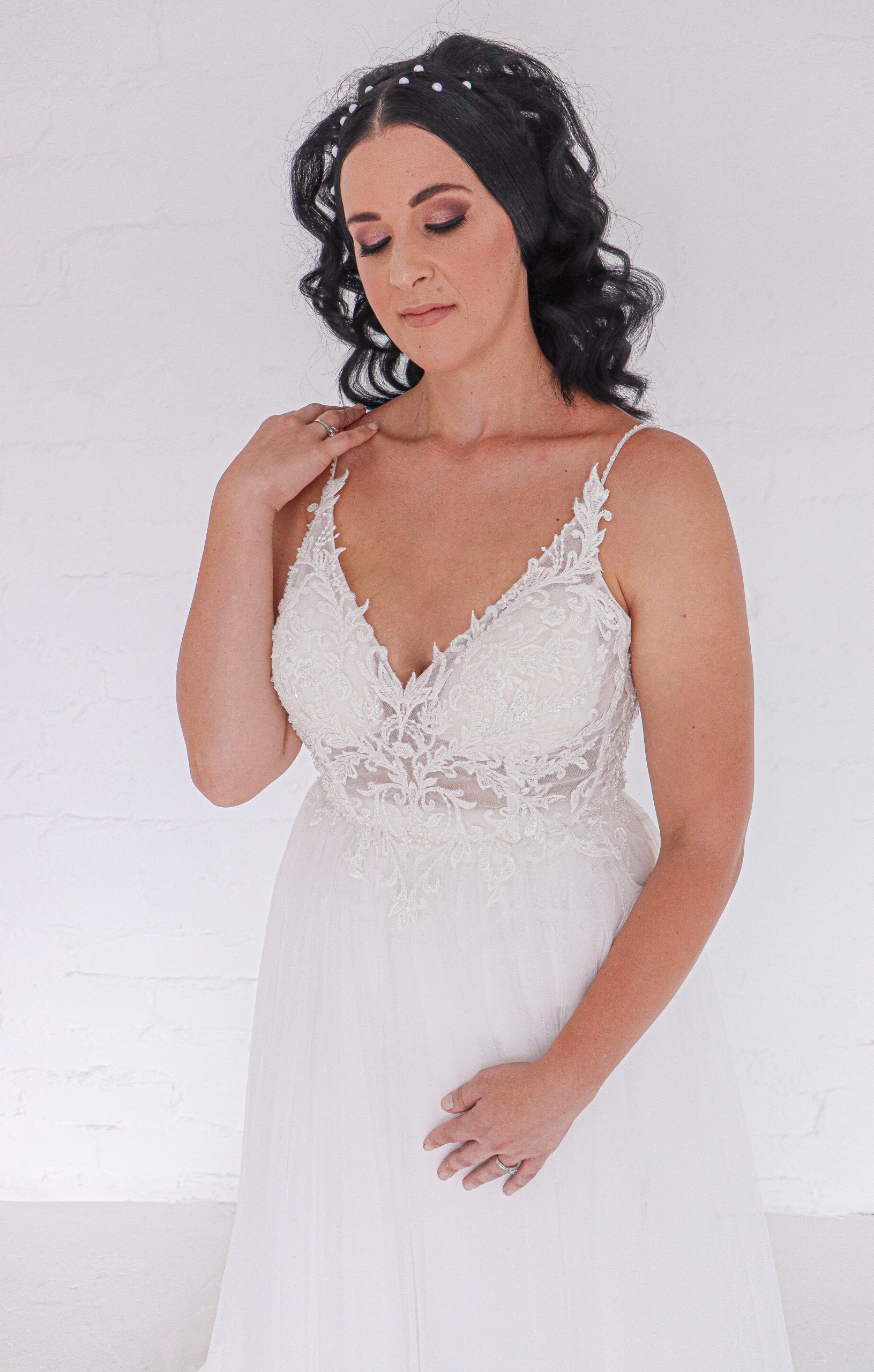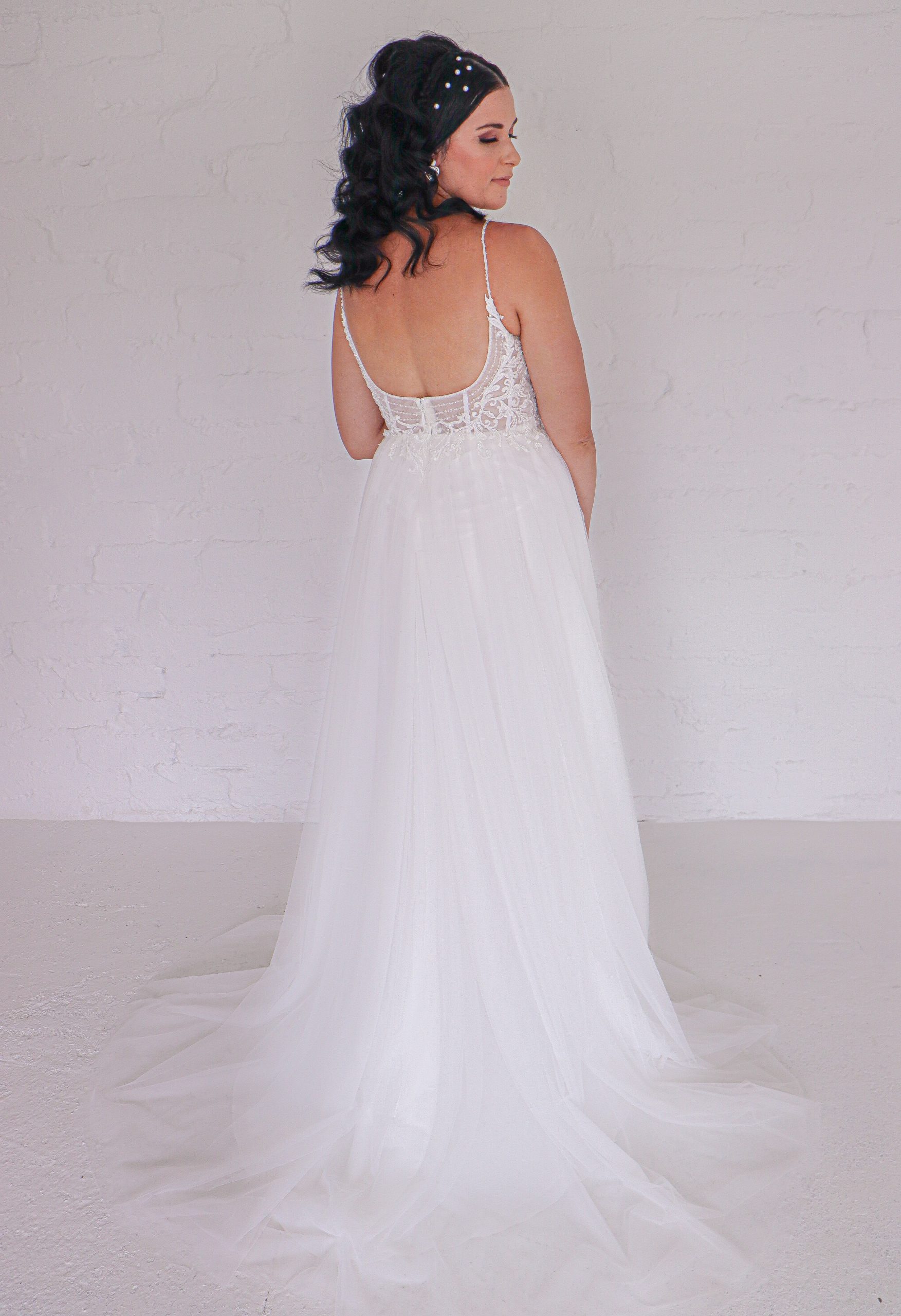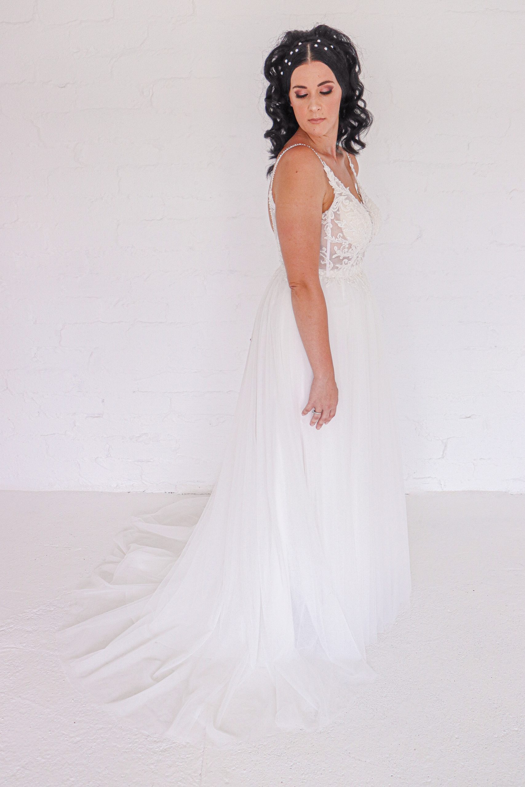 A soft and delicate A-Line with laced bodice and flowy tulle skirt. Her elegant V-neckline is adjoined with thinly beaded straps, trickling into a scooped low back; precisely lined with beaded patterns.