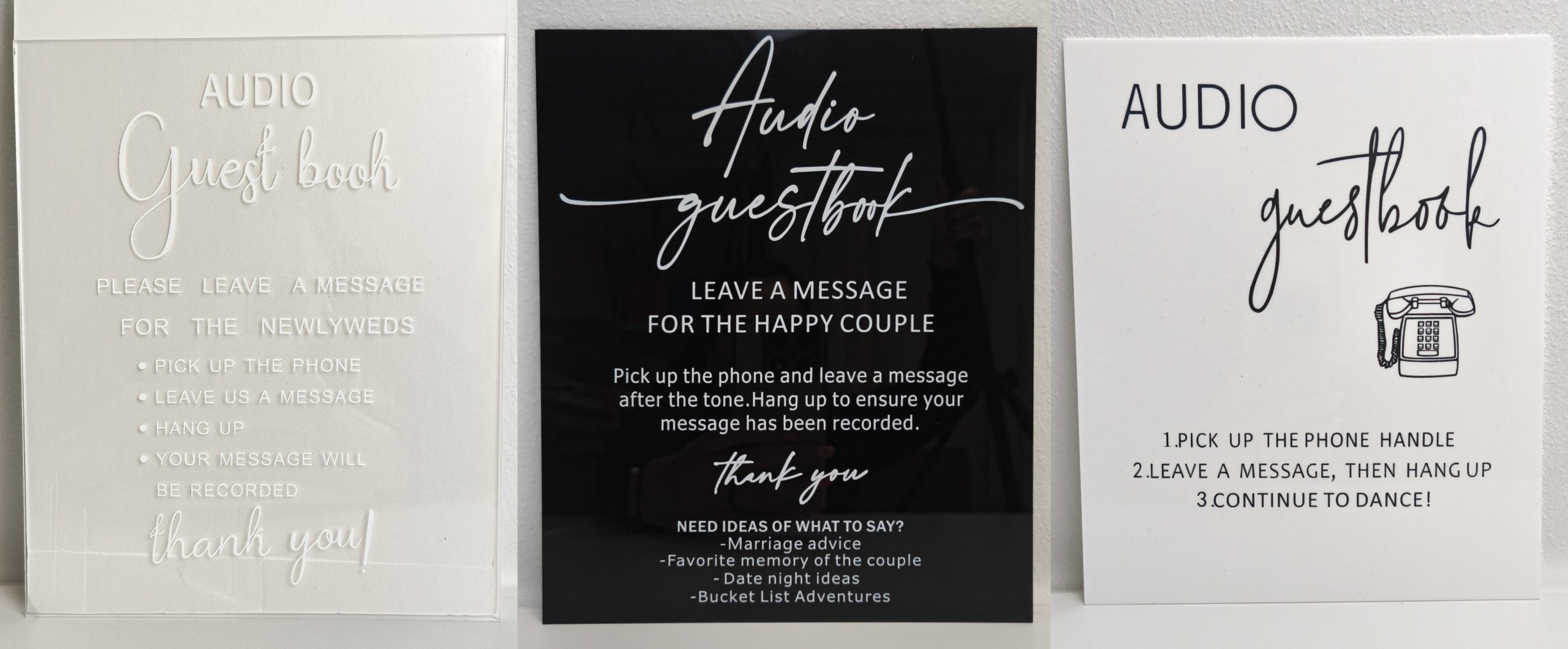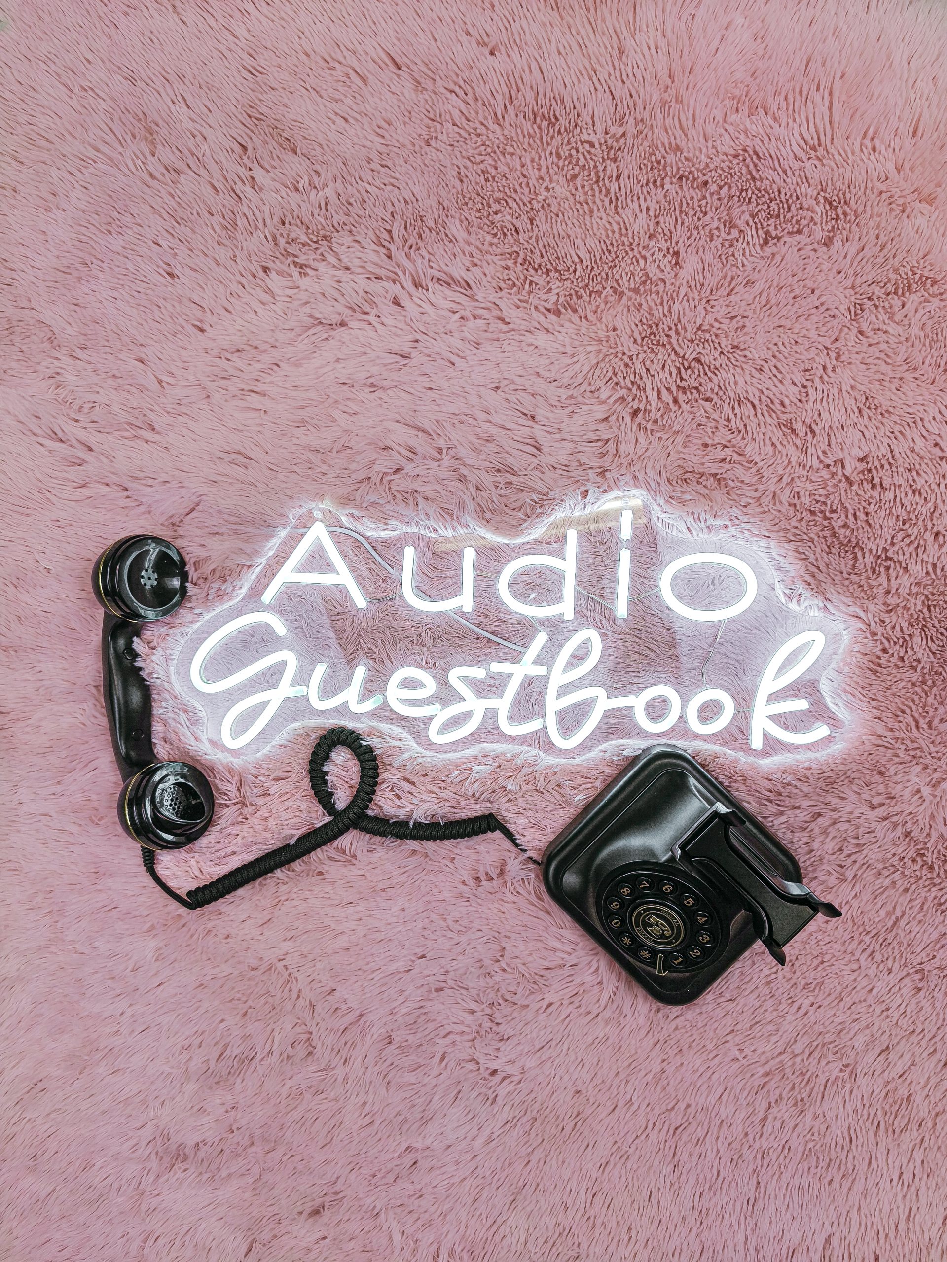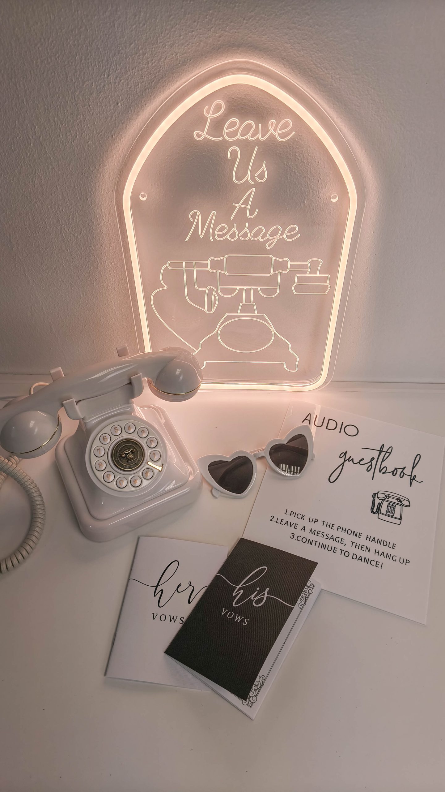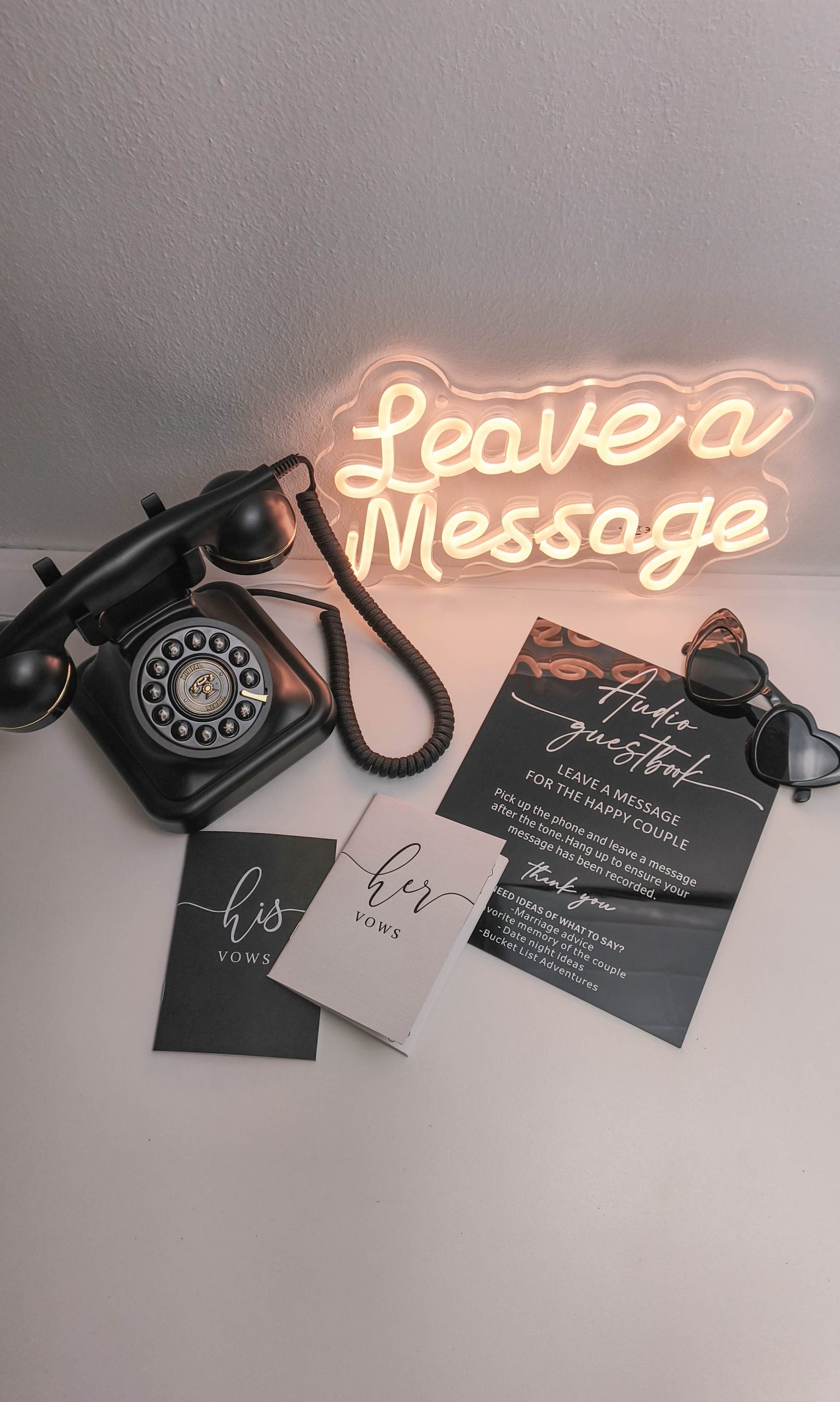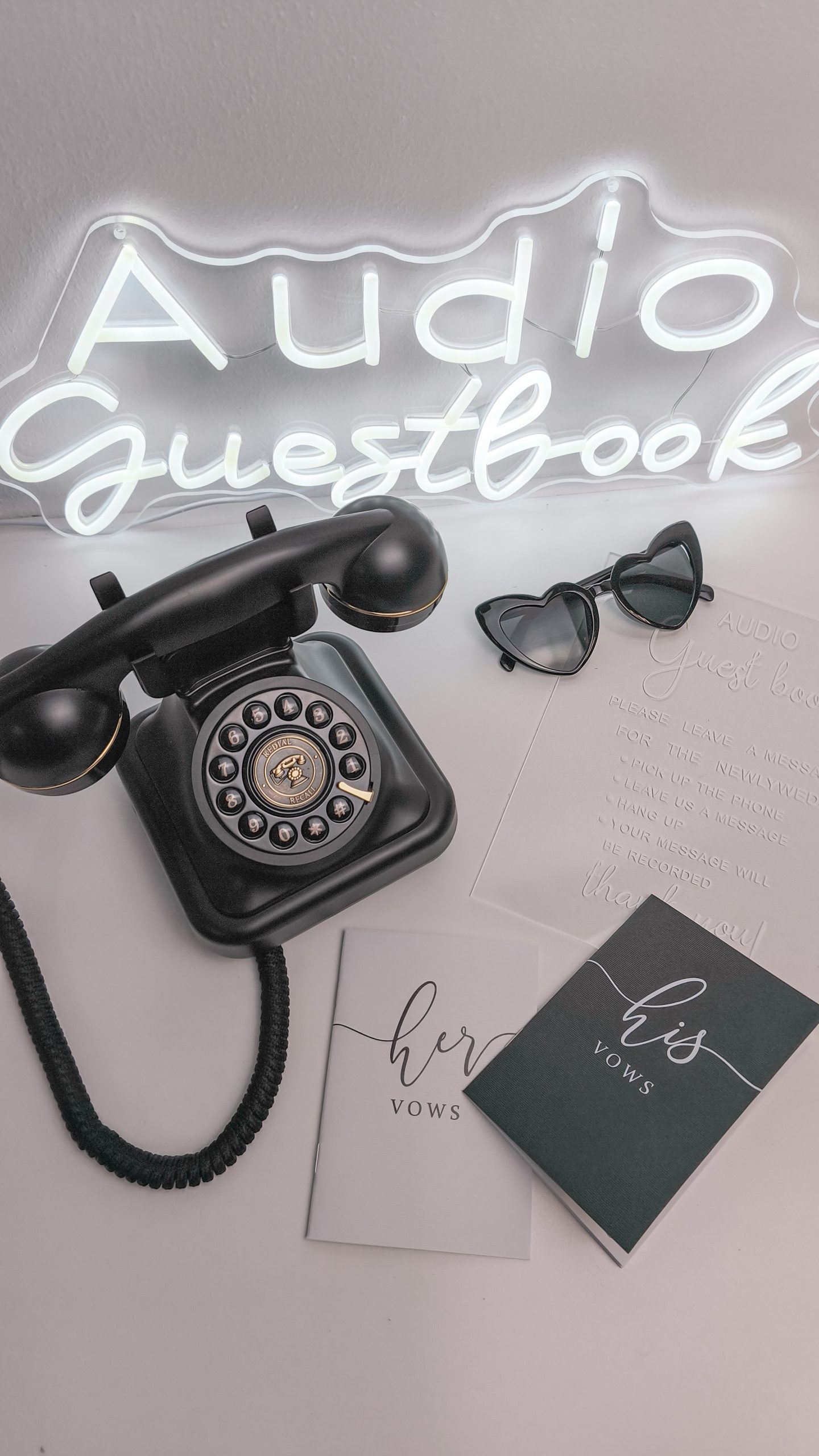 Capture heartfelt messages and unforgettable memories with our Audio Guestbook—a stylish and modern alternative to traditional guestbooks. Featuring a vintage-inspired phone, this setup allows guests to leave personalized voice recordings, creating a keepsake filled with love, laughter, and well-wishes.