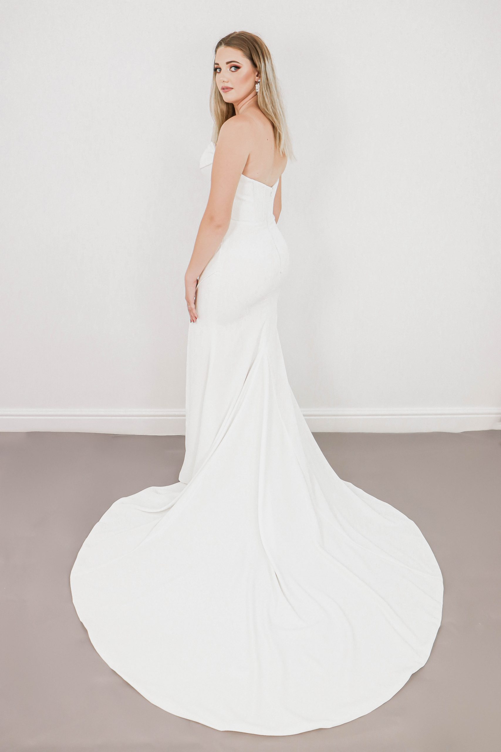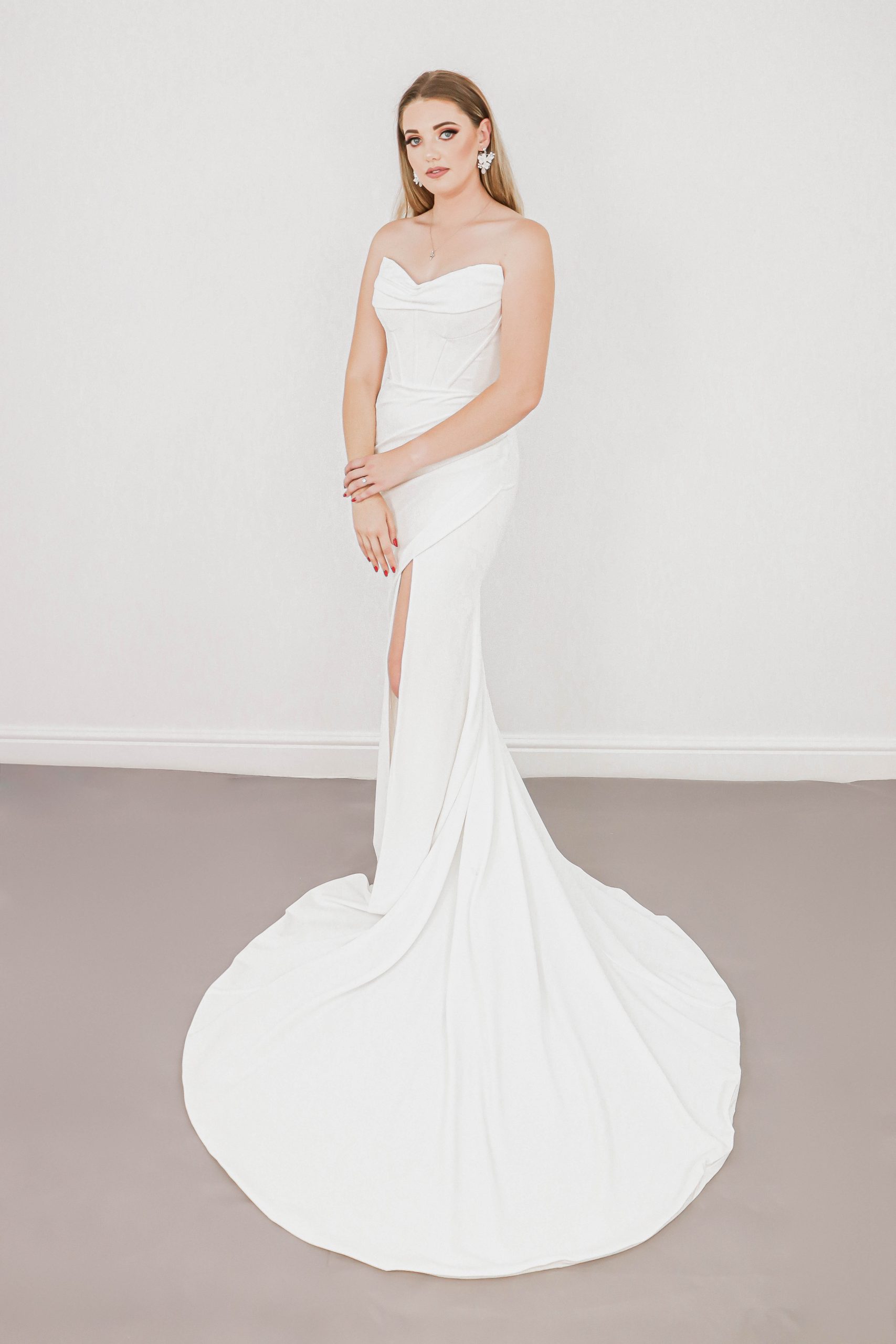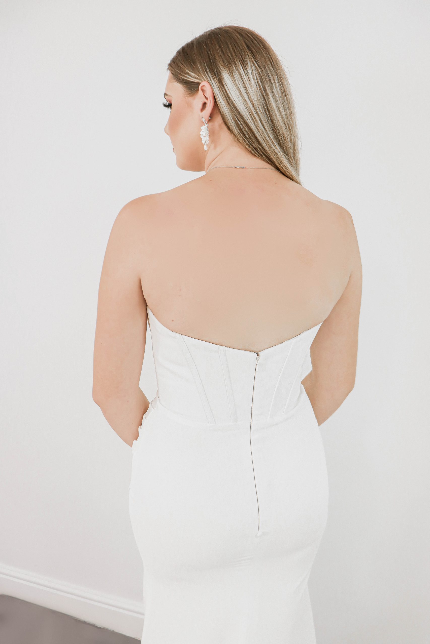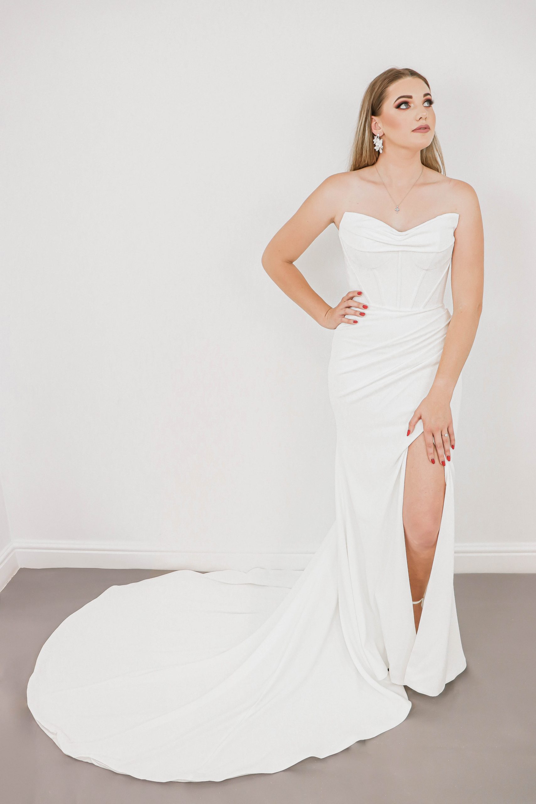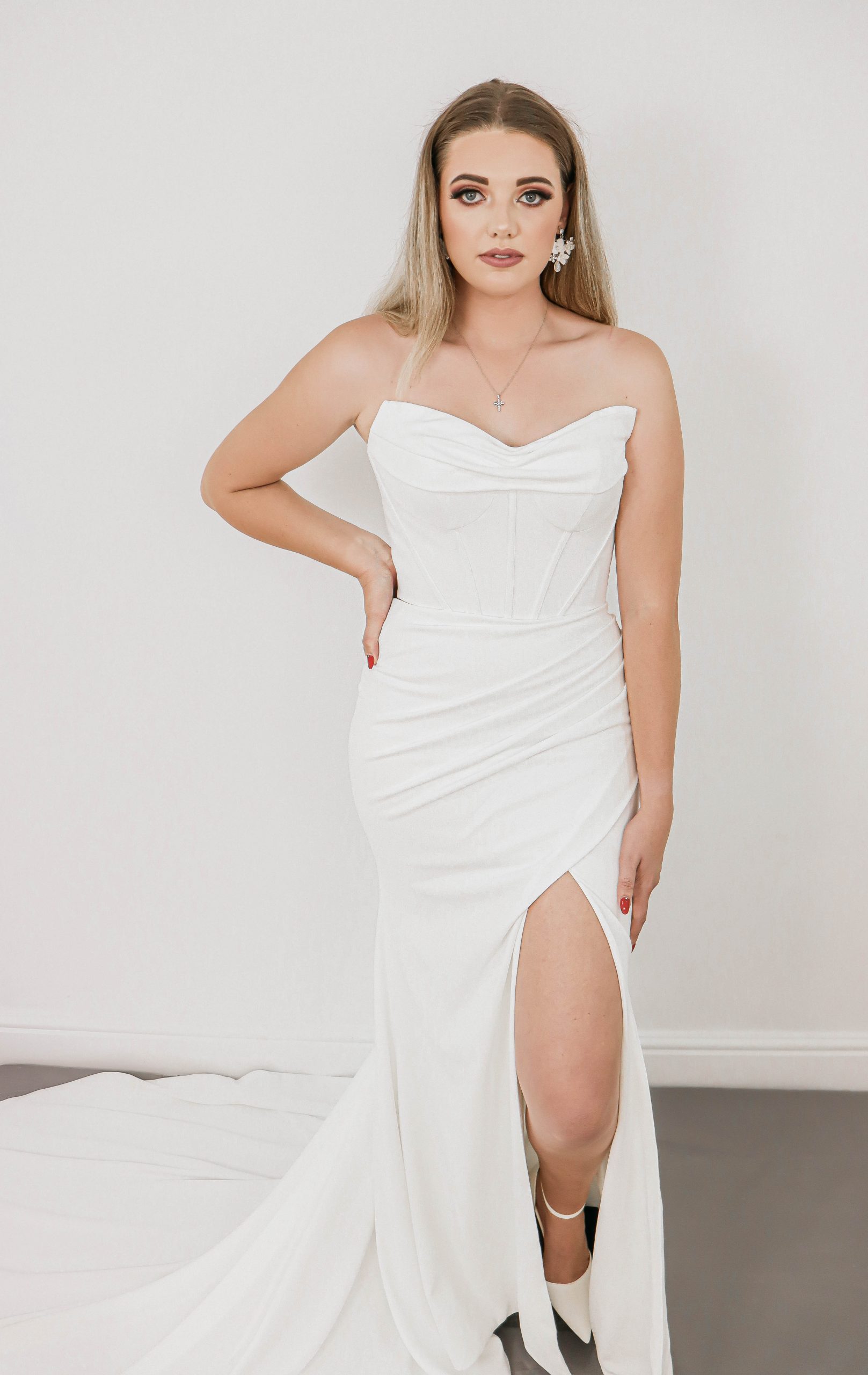 This wedding dress is a chic and modern strapless gown featuring a structured corset-style bodice with subtle draping for added texture. The pointed sweetheart neckline highlights elegance and femininity, while the fitted silhouette adds a touch of sexiness with a high slit. This dress is perfect for a contemporary bride seeking a sleek and minimalist look.