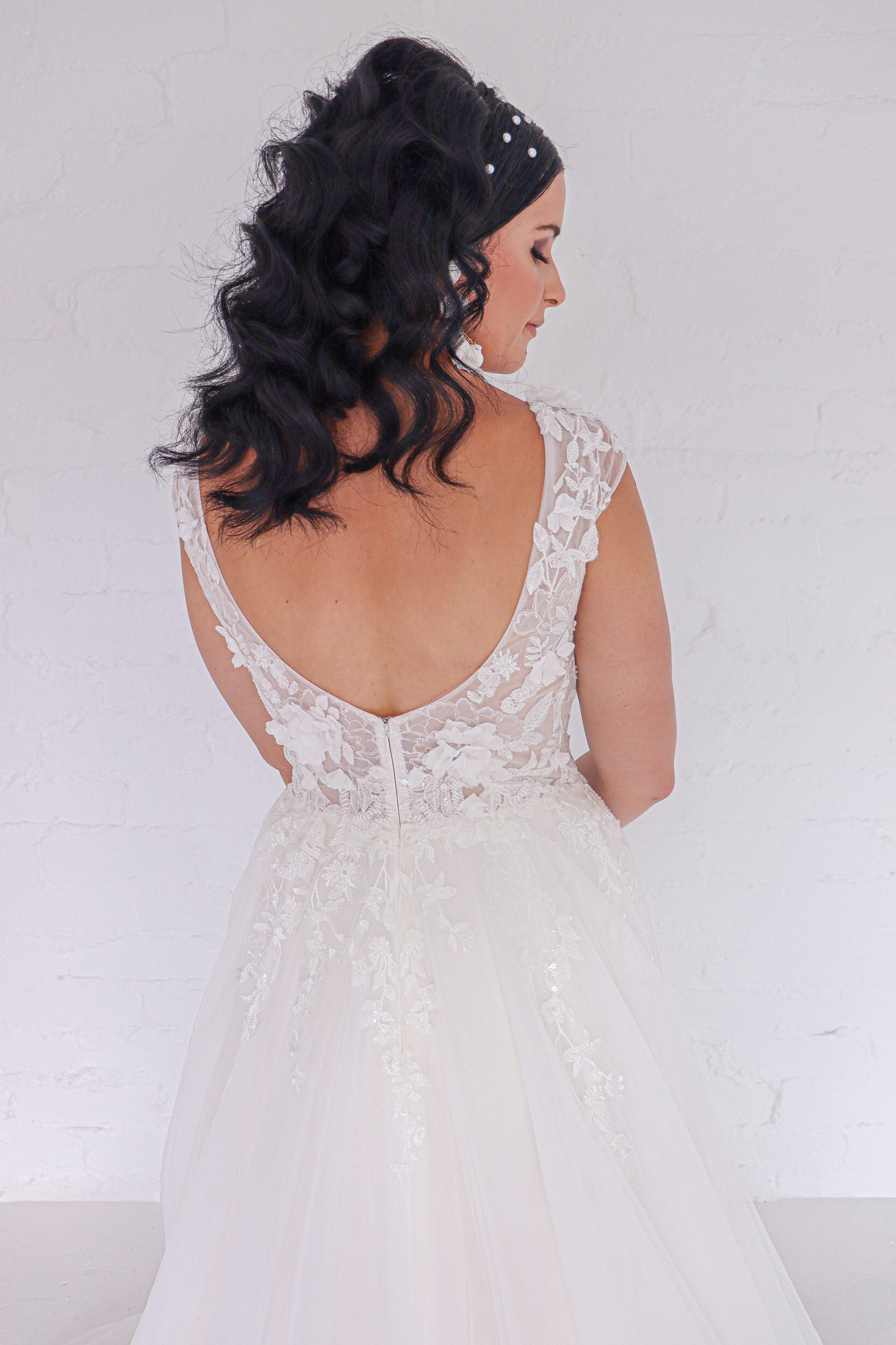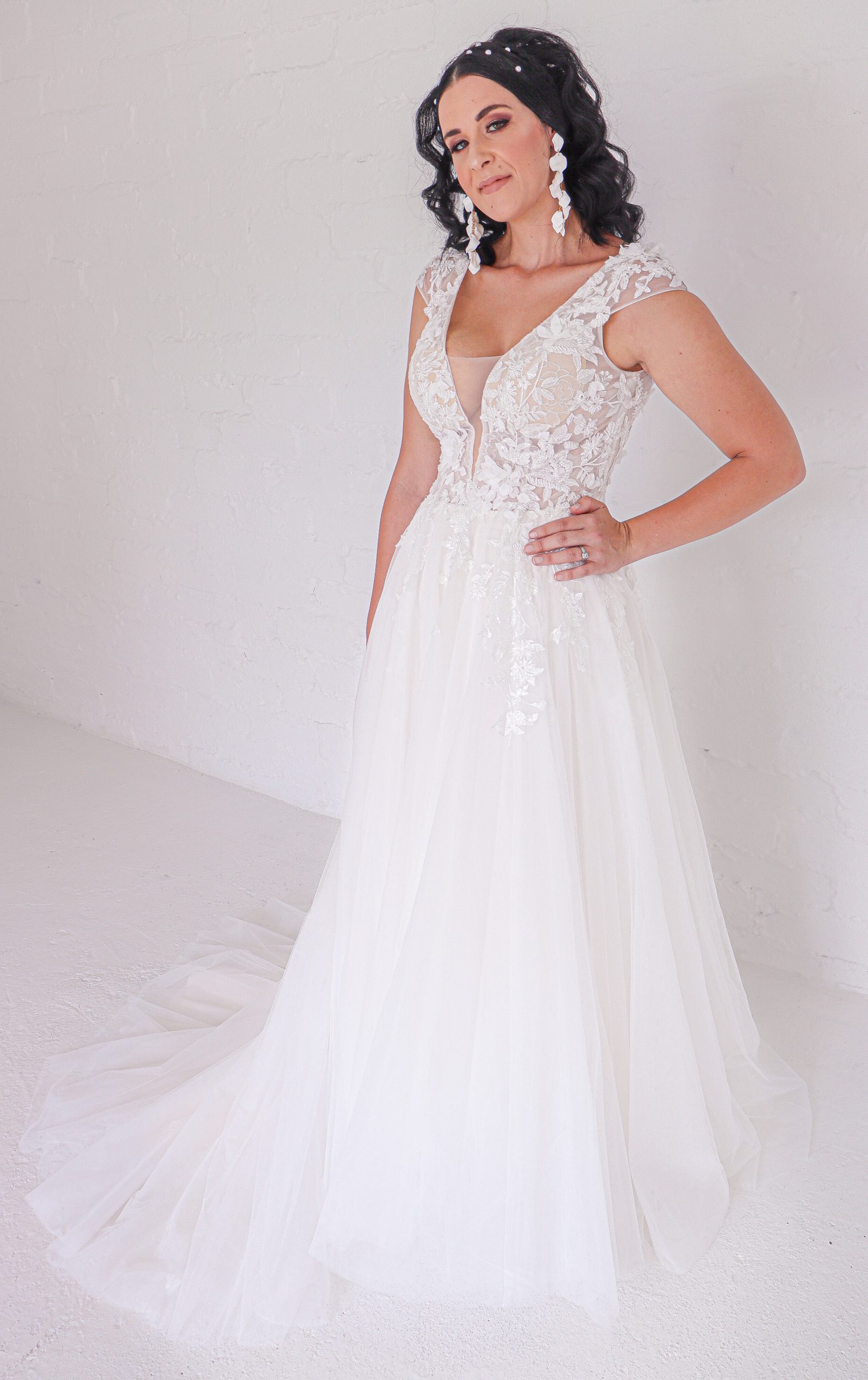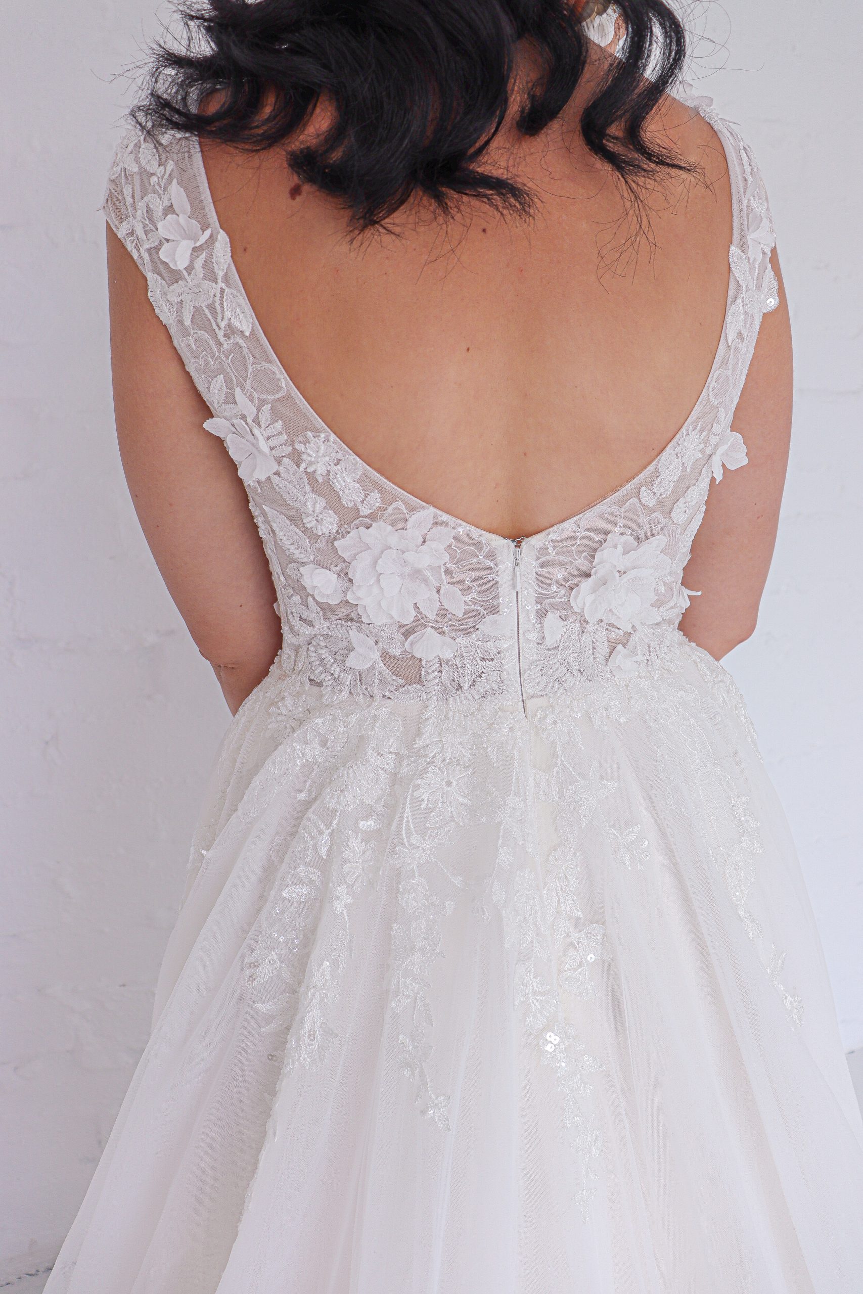 This soft A-Line is embodied with beautiful 3D floral lace embellishments. Consisting of a deep V-neckline with subtle open back, she is rounded off with delicate capped sleeves.