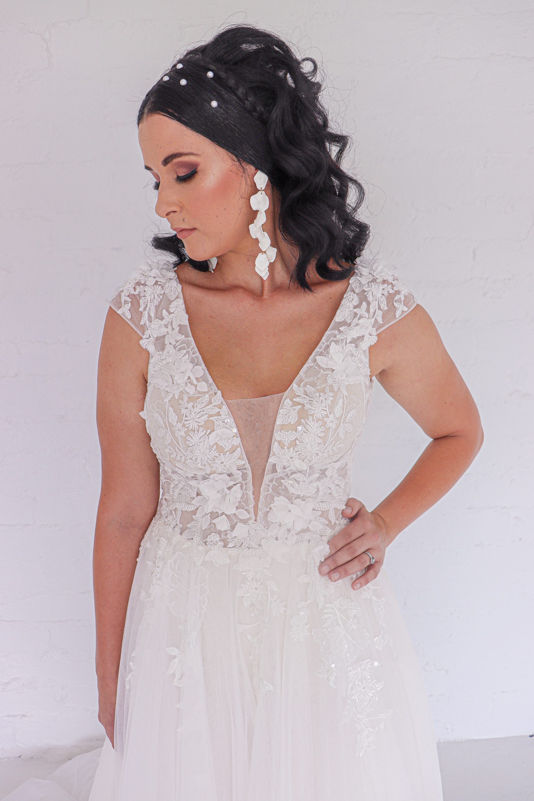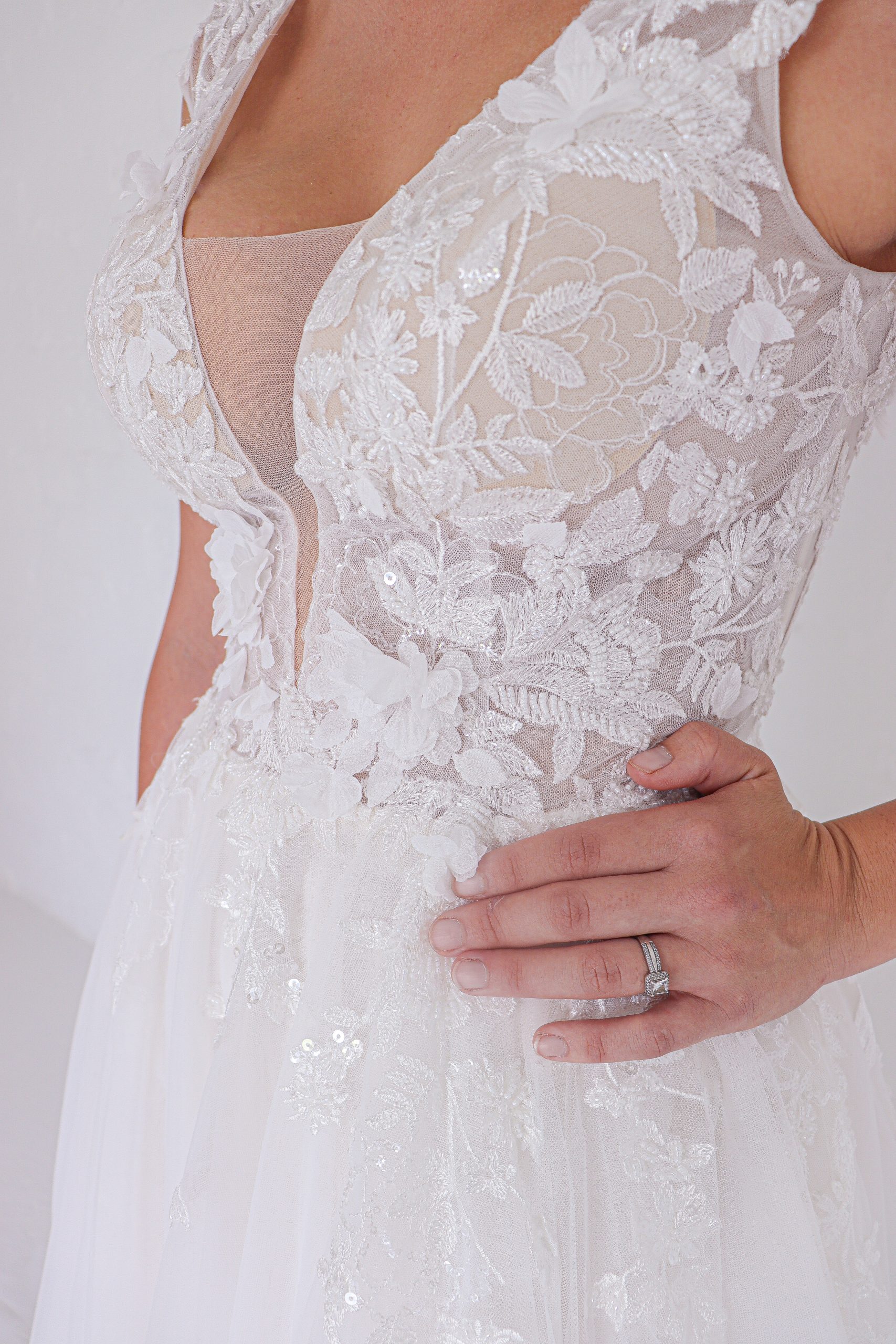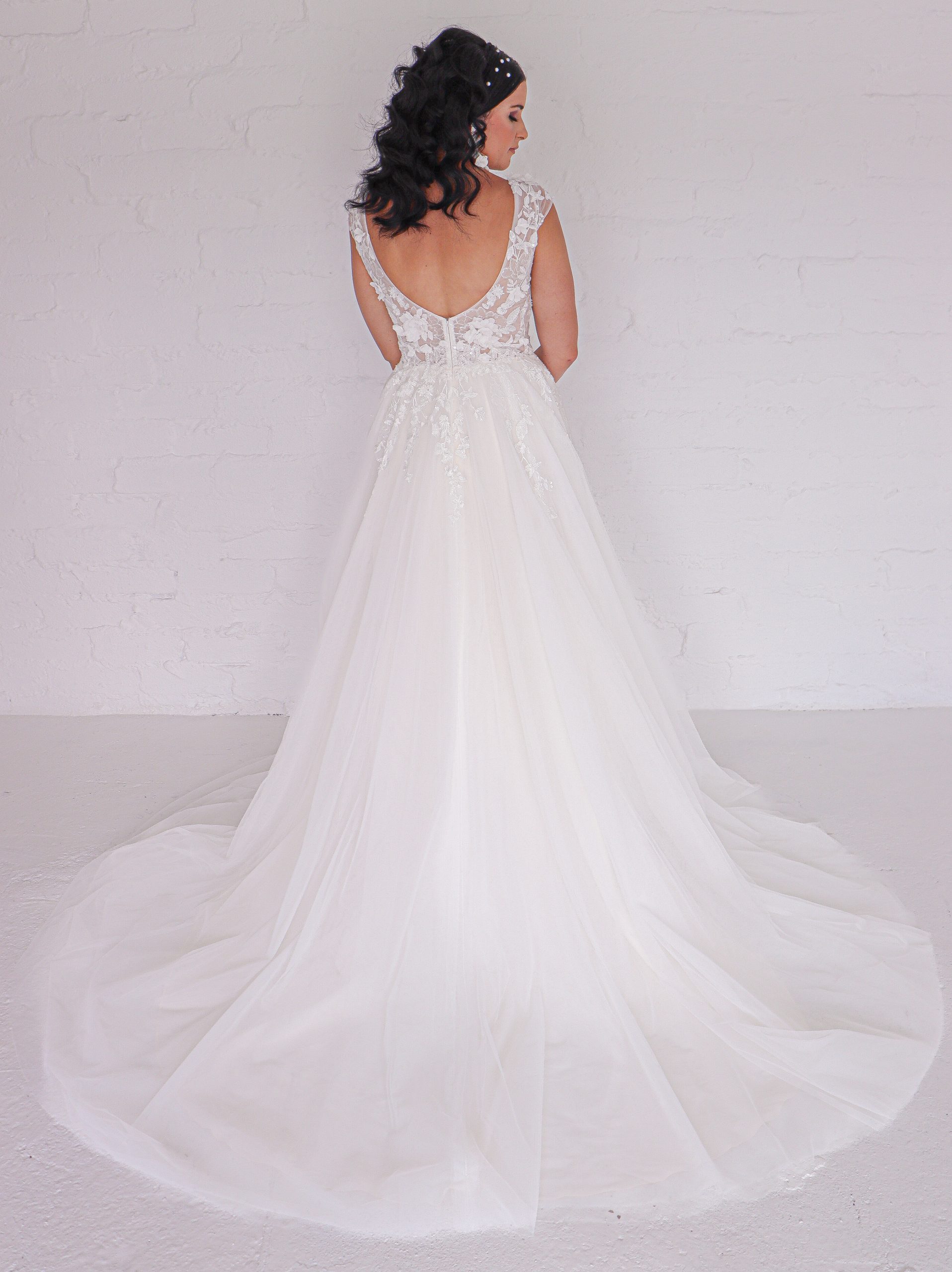 This soft A-Line is embodied with beautiful 3D floral lace embellishments. Consisting of a deep V-neckline with subtle open back, she is rounded off with delicate capped sleeves.