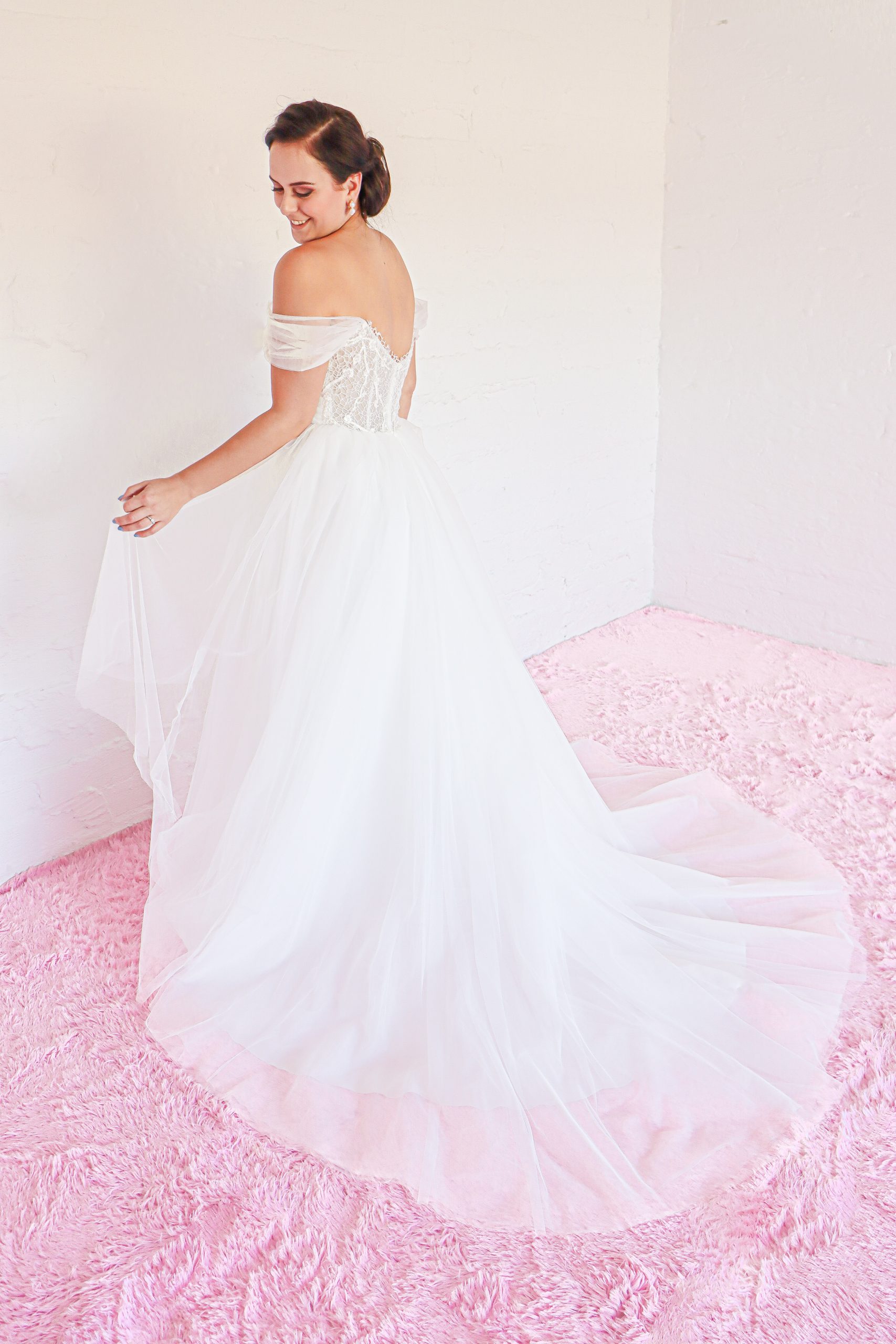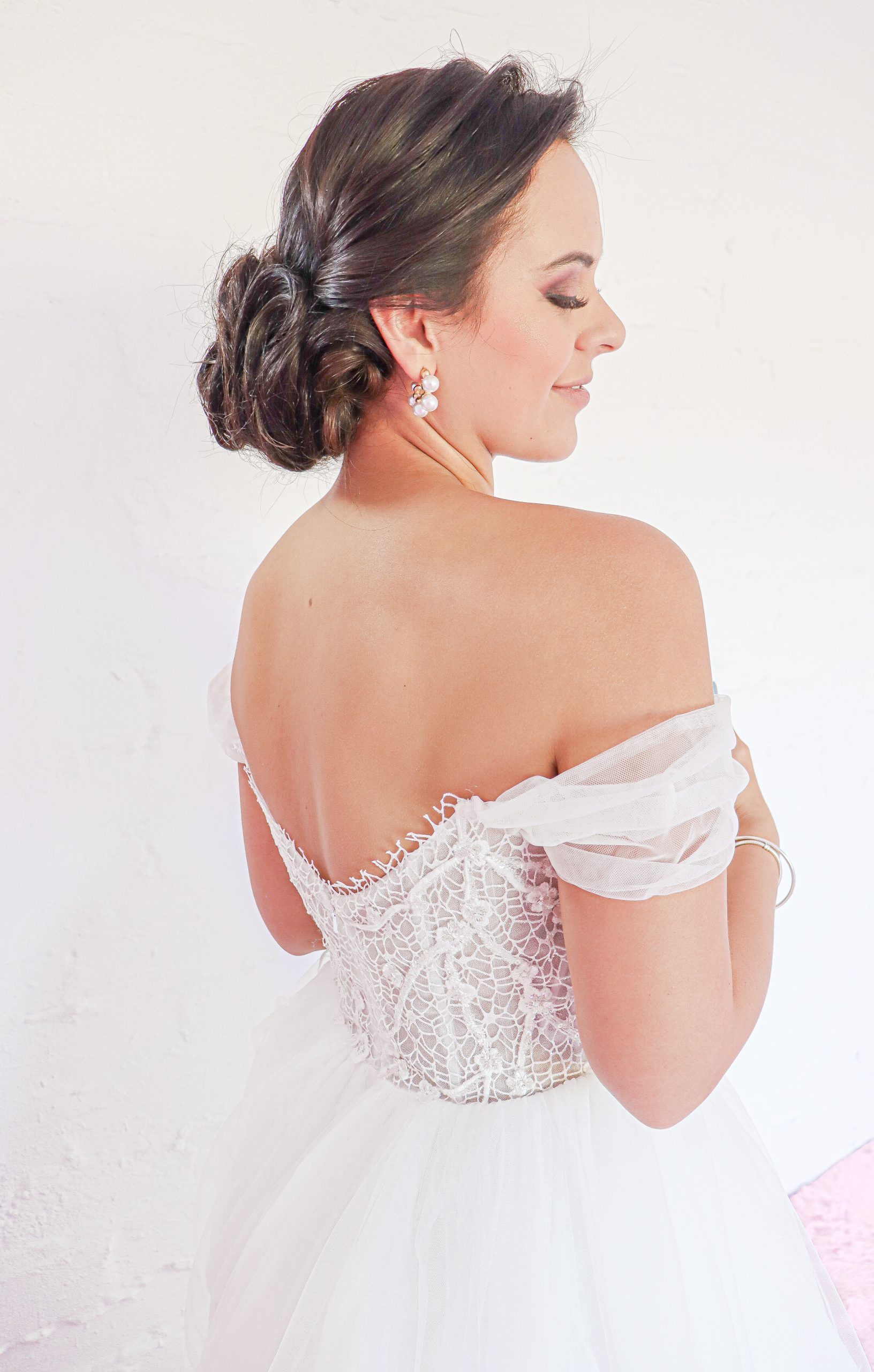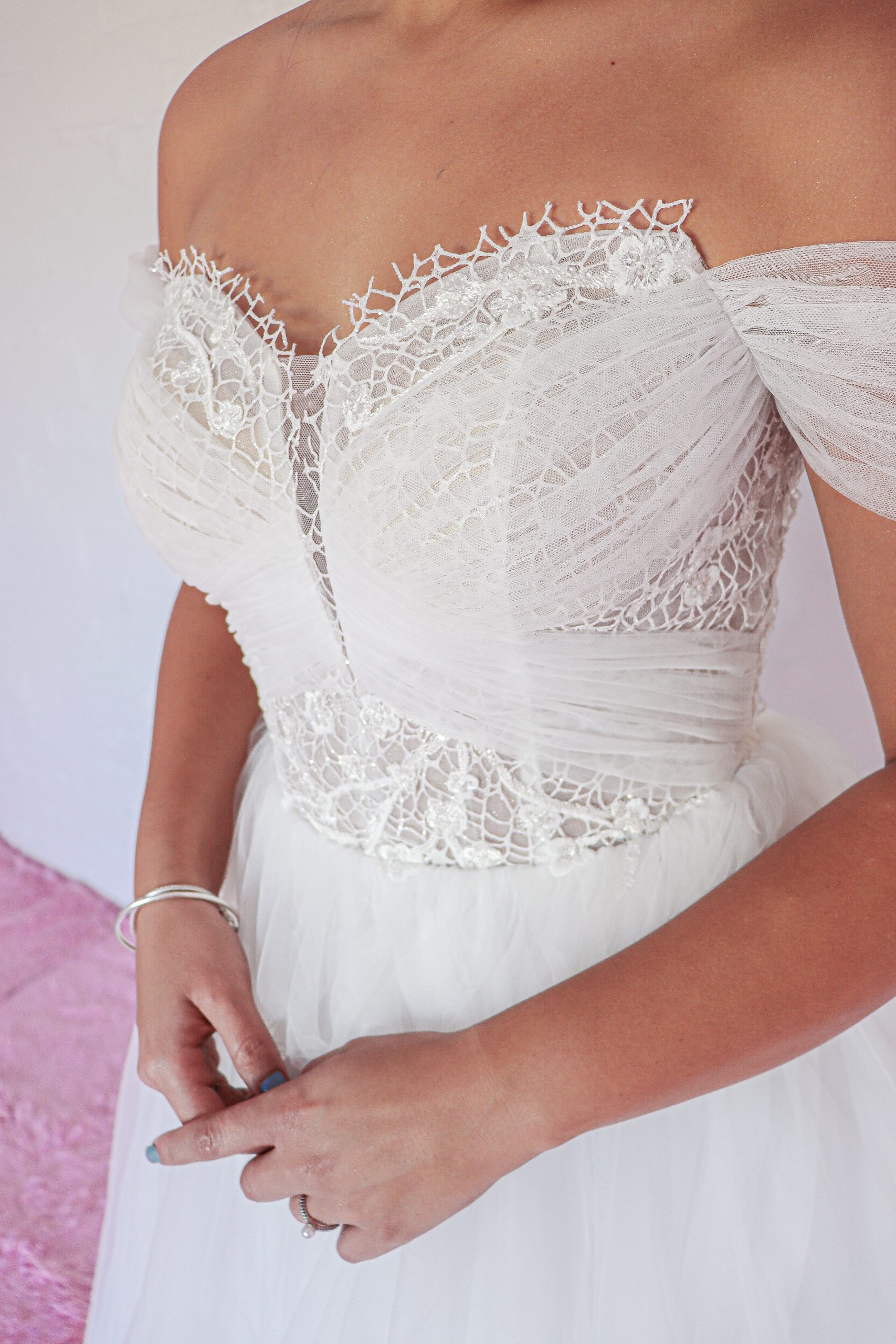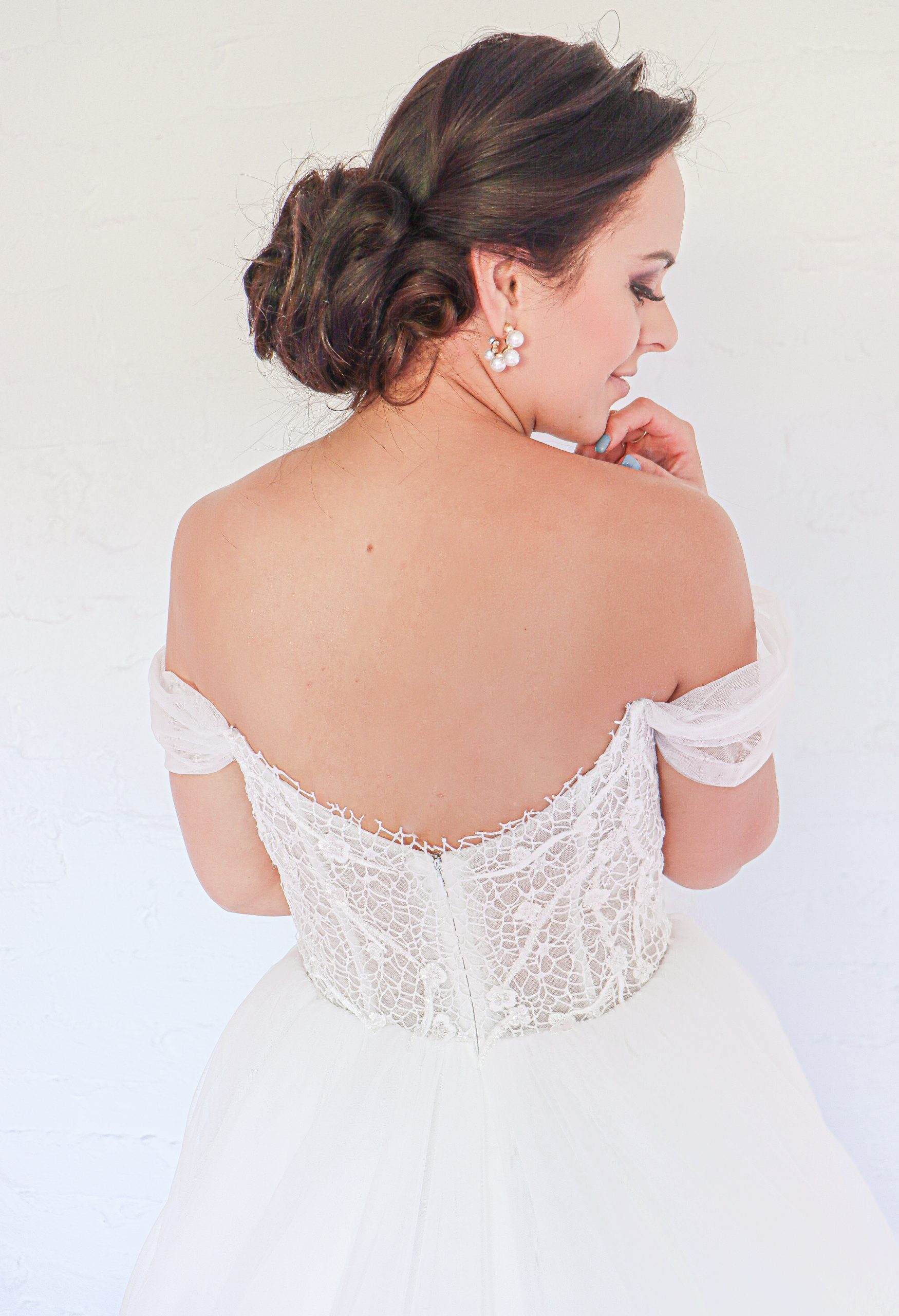 This fairytale Ballgown with sweetheart neckline consists of intricate lace details on the bodice criss-crossed with unique tulle patterns. Her soft tulle layered skirt ties in perfectly with her tulle off-shoulder sleeves.