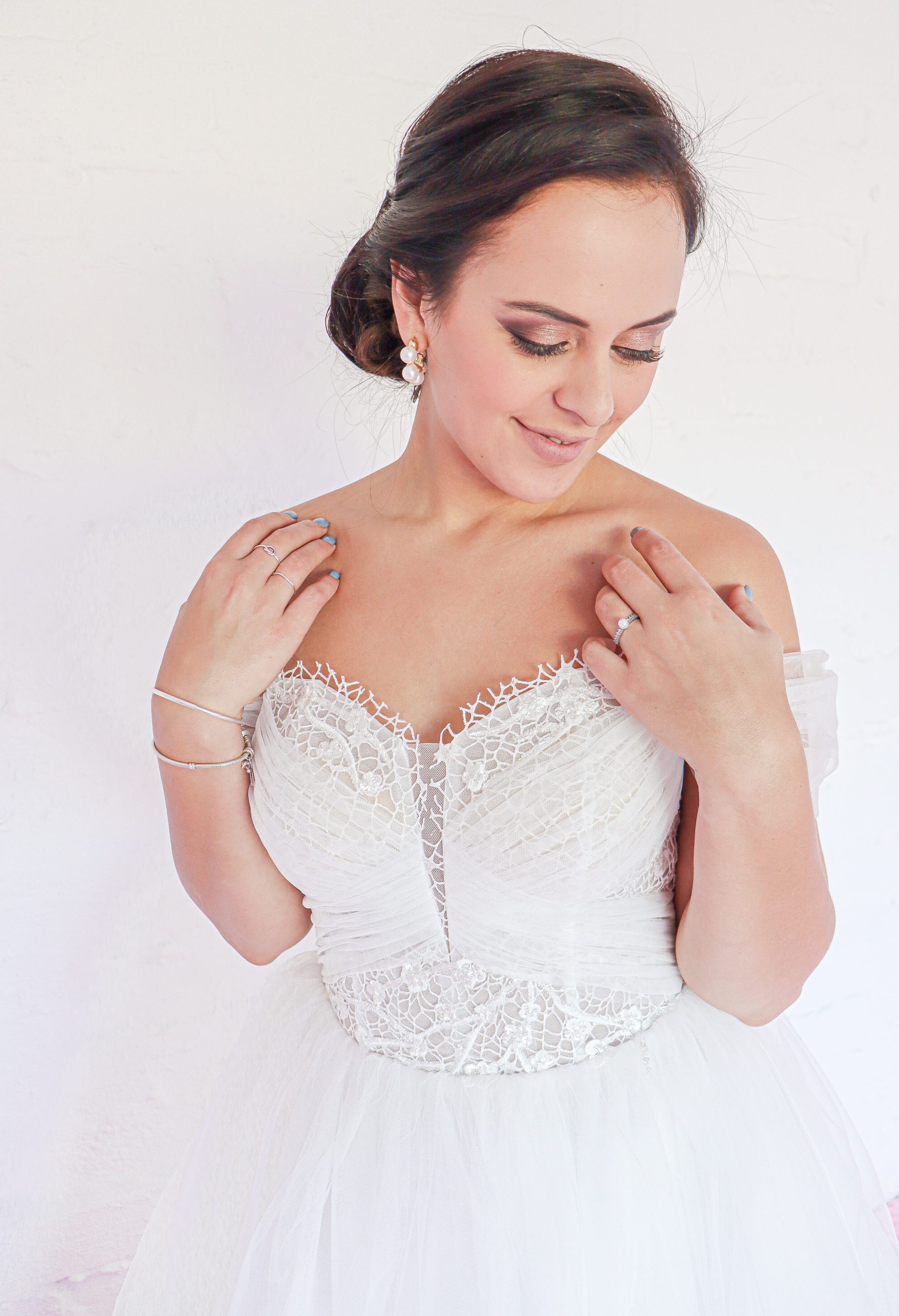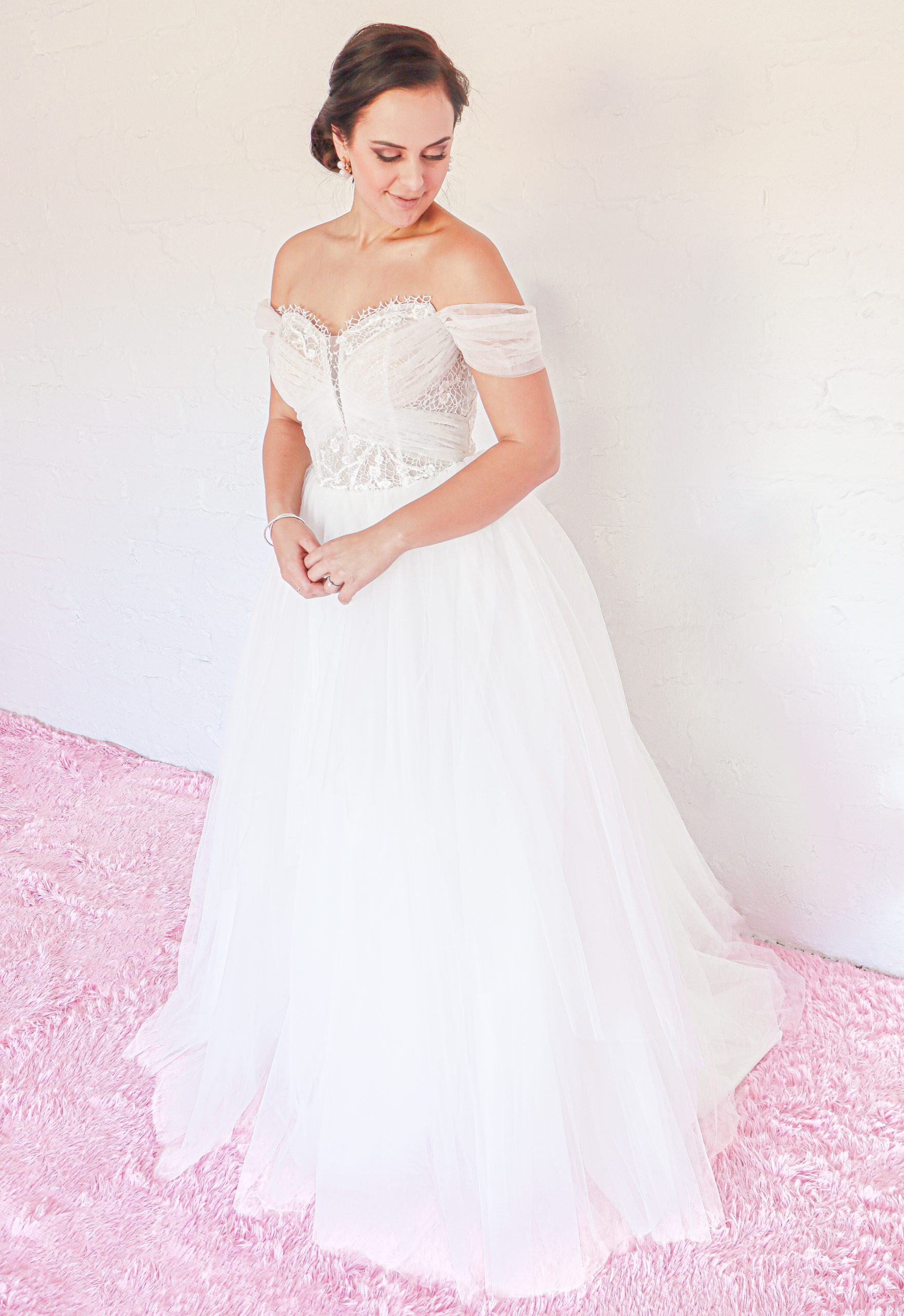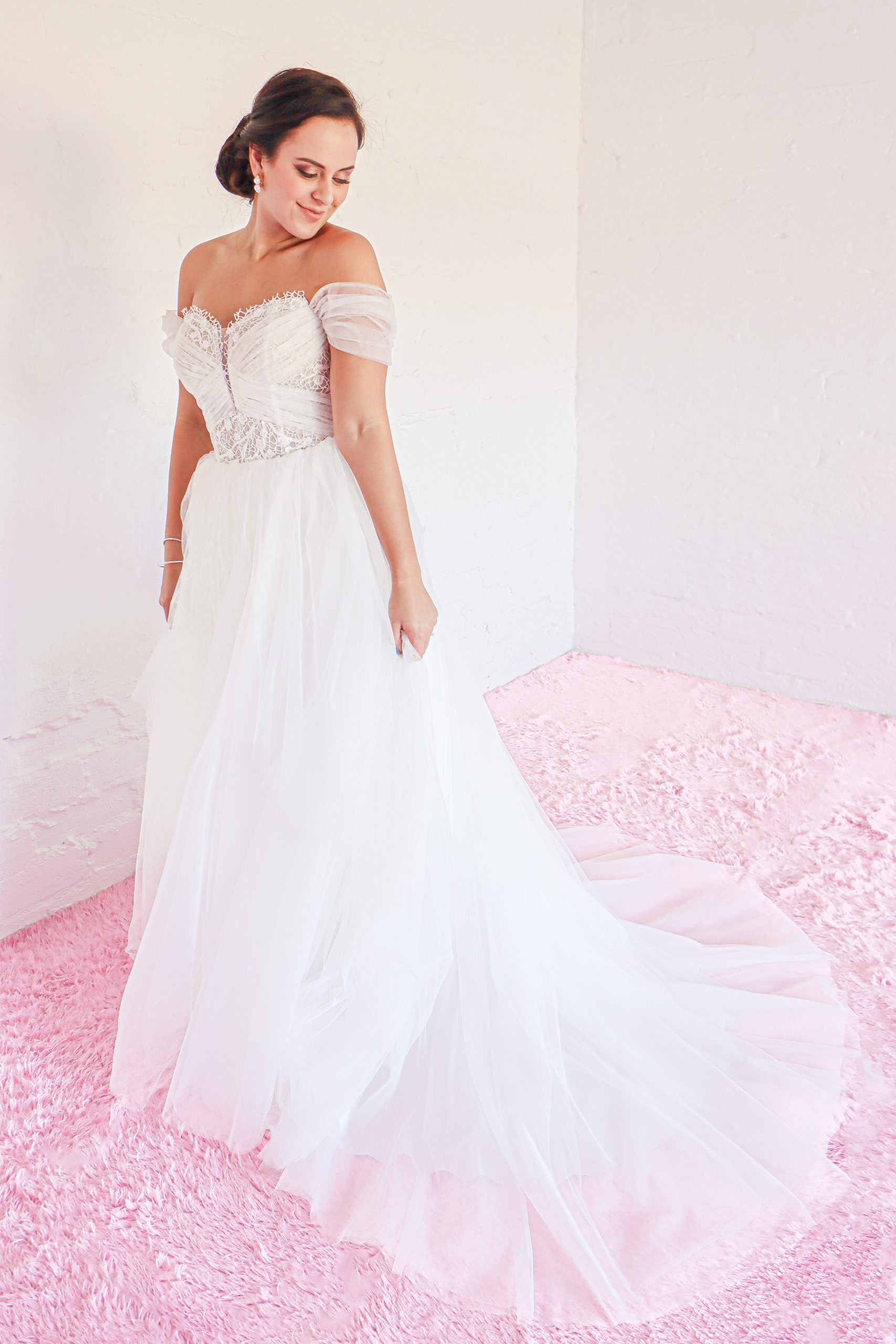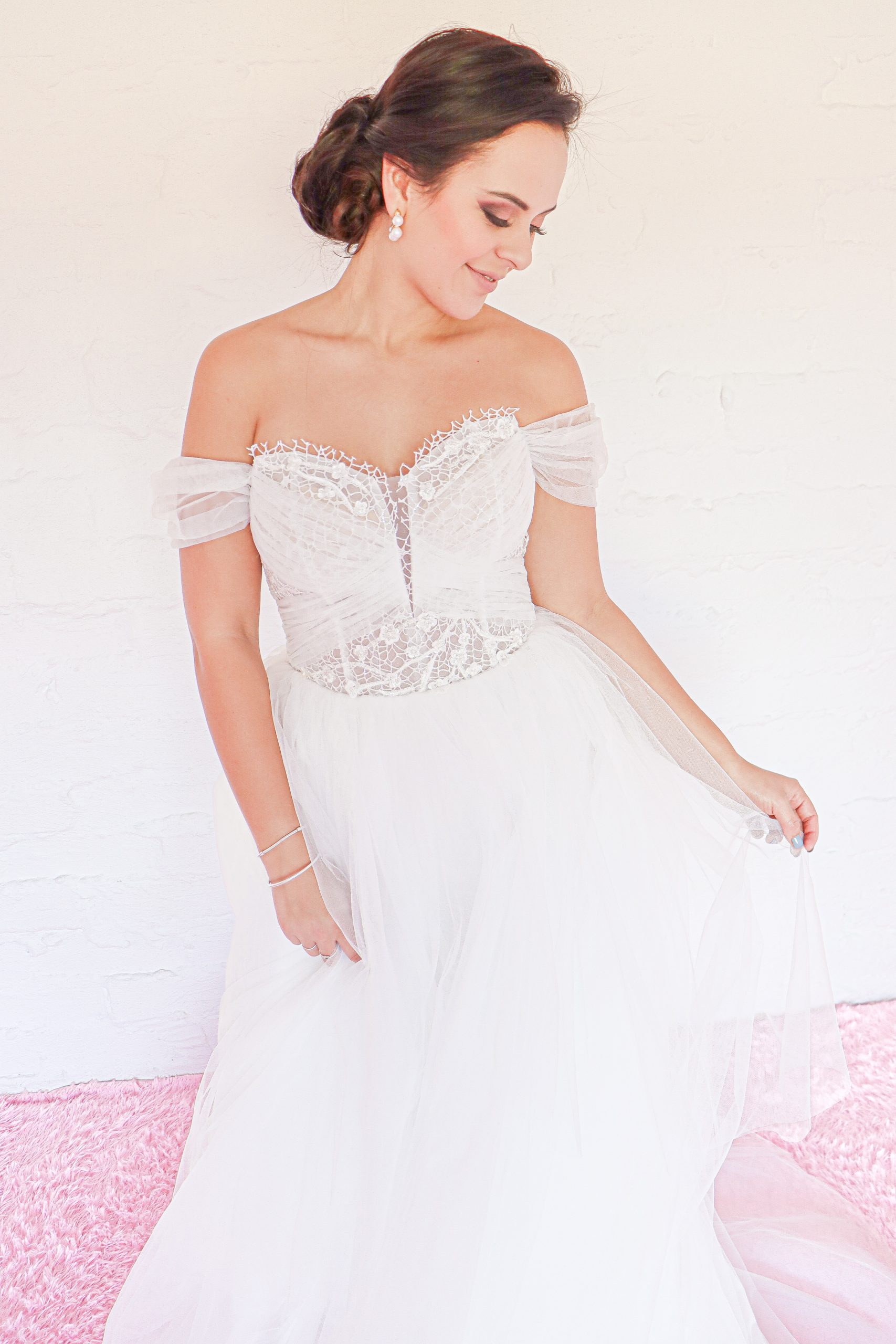 This fairytale Ballgown with sweetheart neckline consists of intricate lace details on the bodice criss-crossed with unique tulle patterns. Her soft tulle layered skirt ties in perfectly with her tulle off-shoulder sleeves.