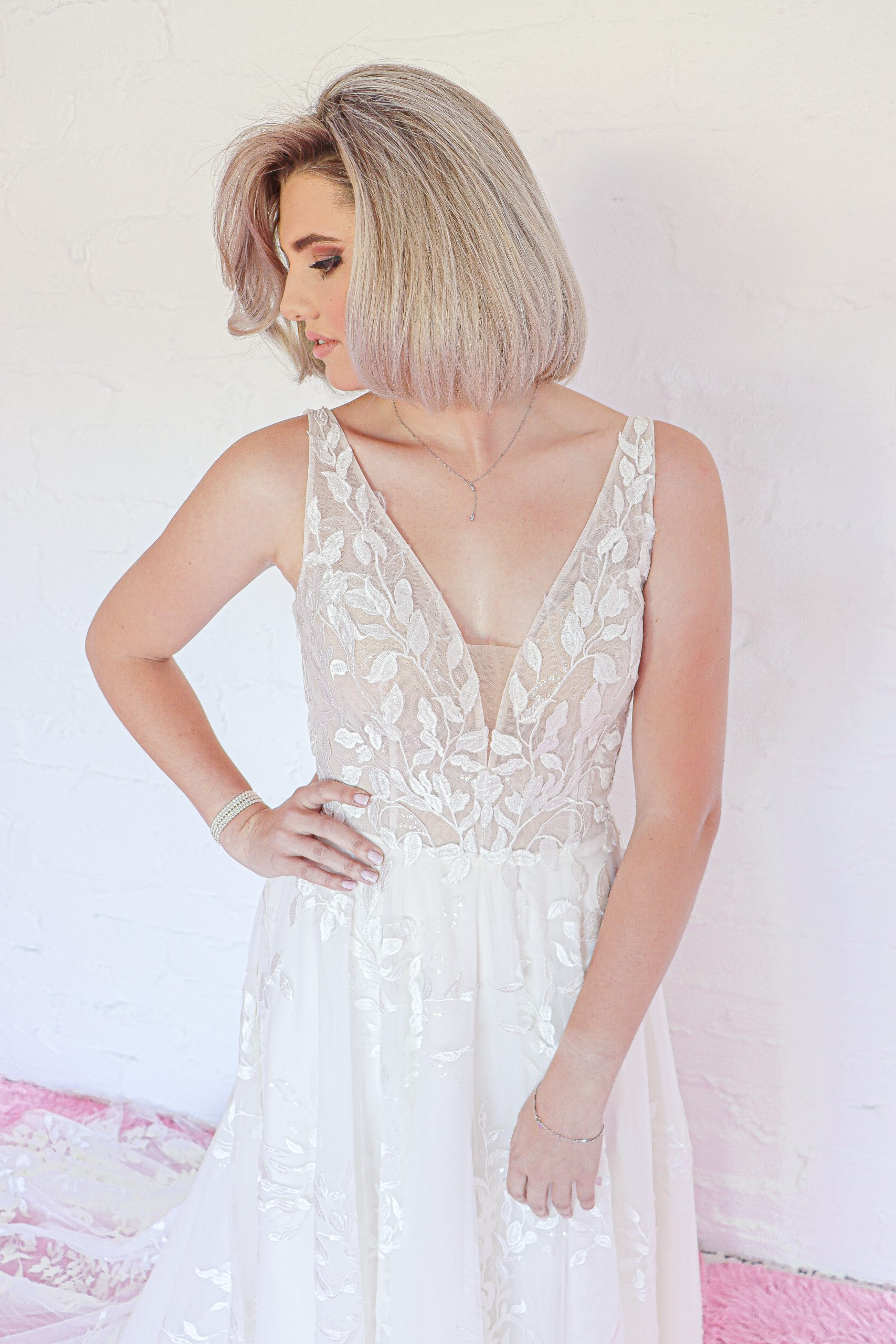 This exquisite A-Line with plunging neckline and scooped button-tied open back, is fully adorned with leaf and floral embellishments, selectively decorated with a slight sequin shine. This adds to her perfect whimsical feel.