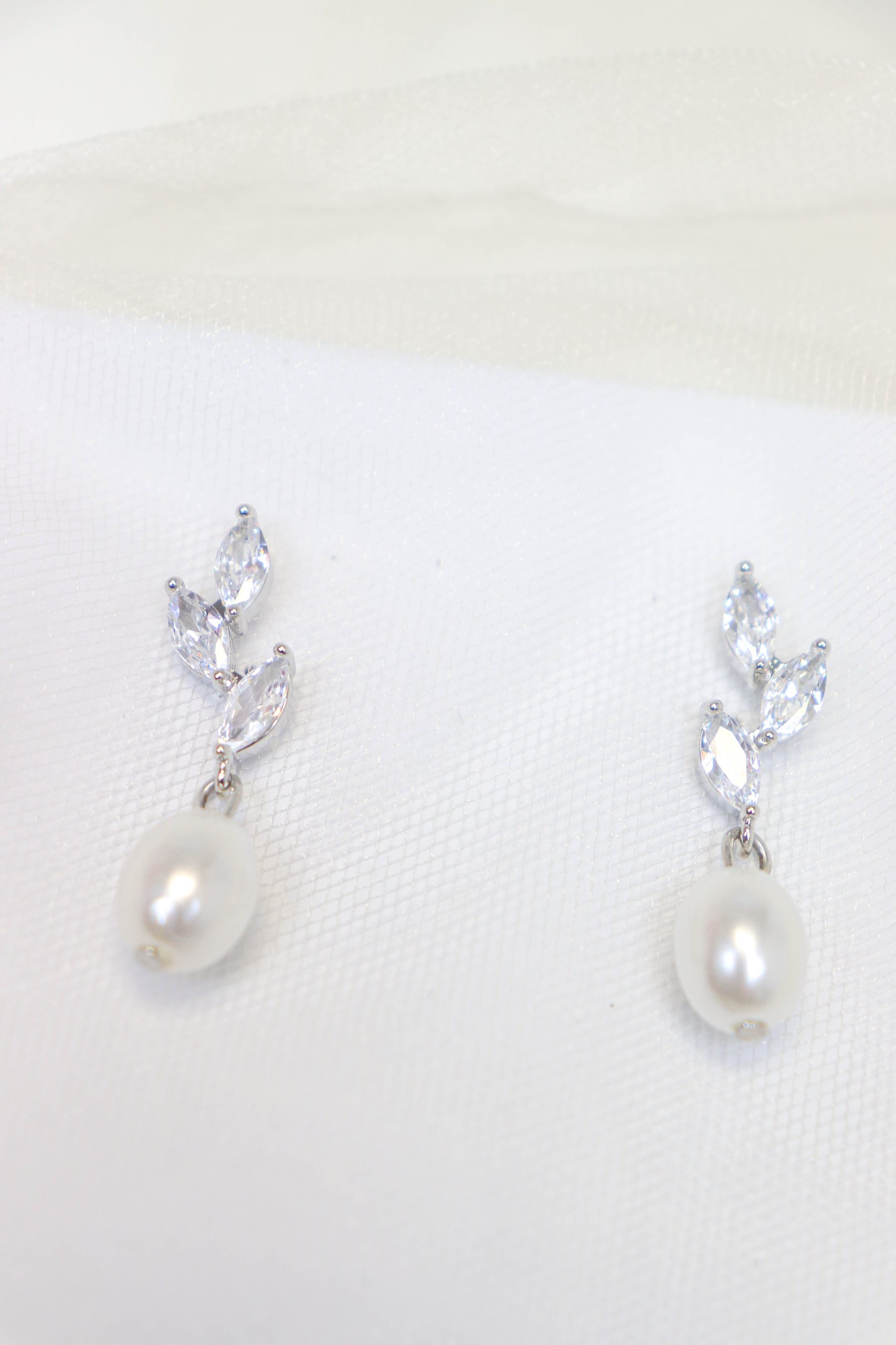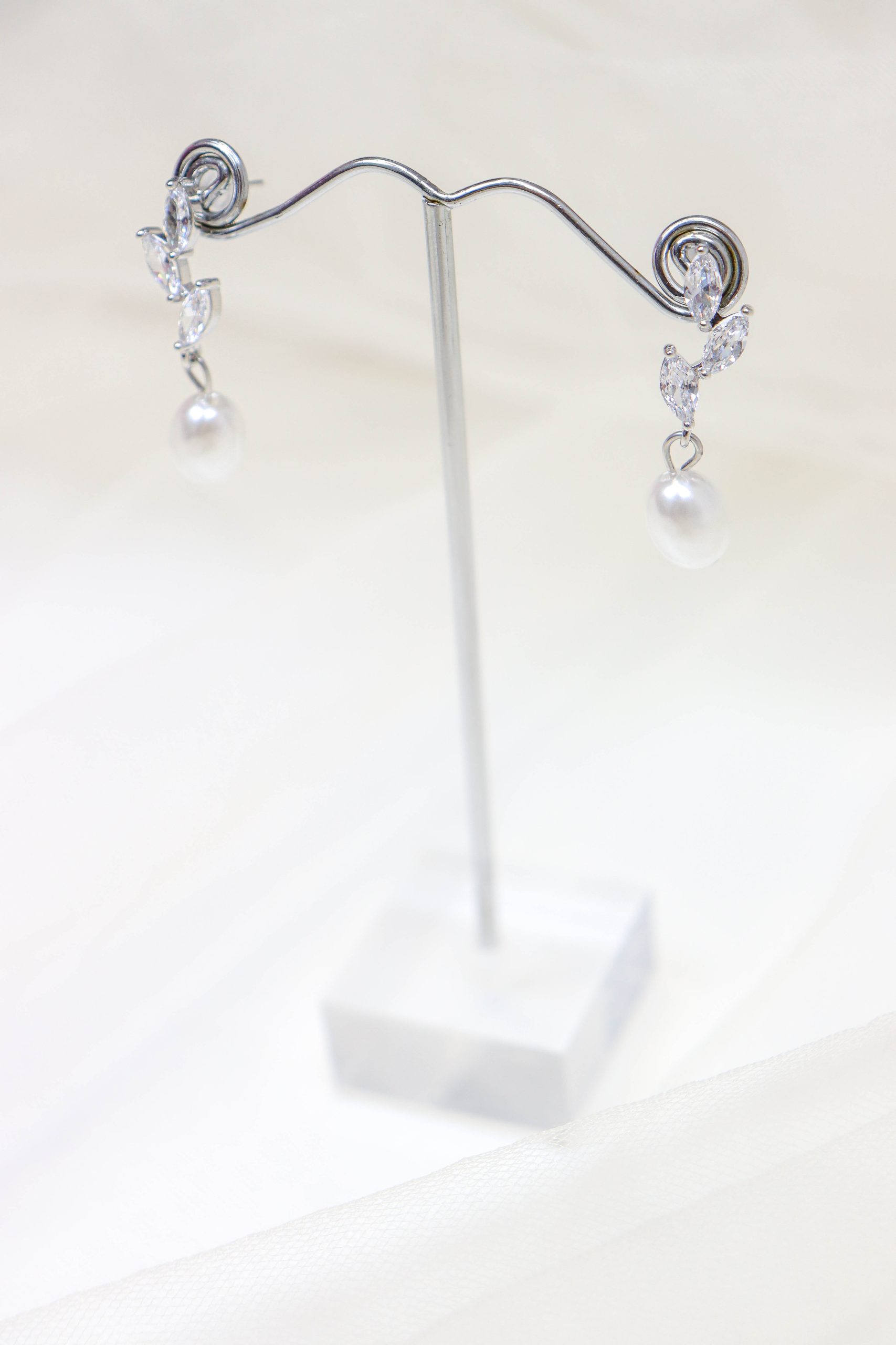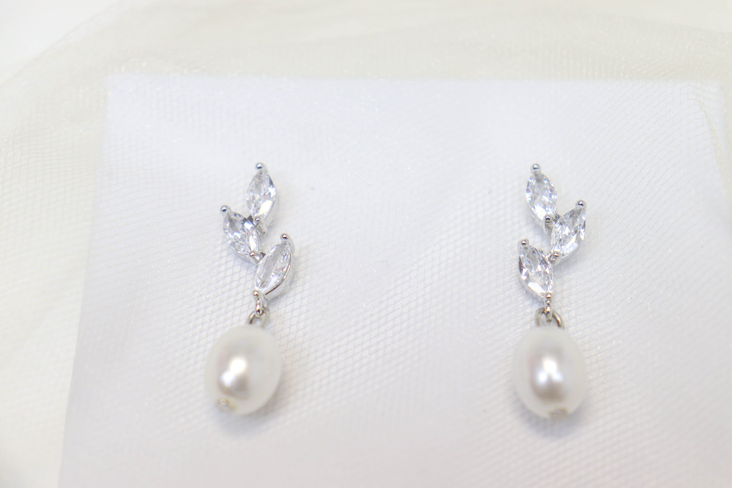 Cubic Zirconia leaf detail with a dangling pearl in color silver.