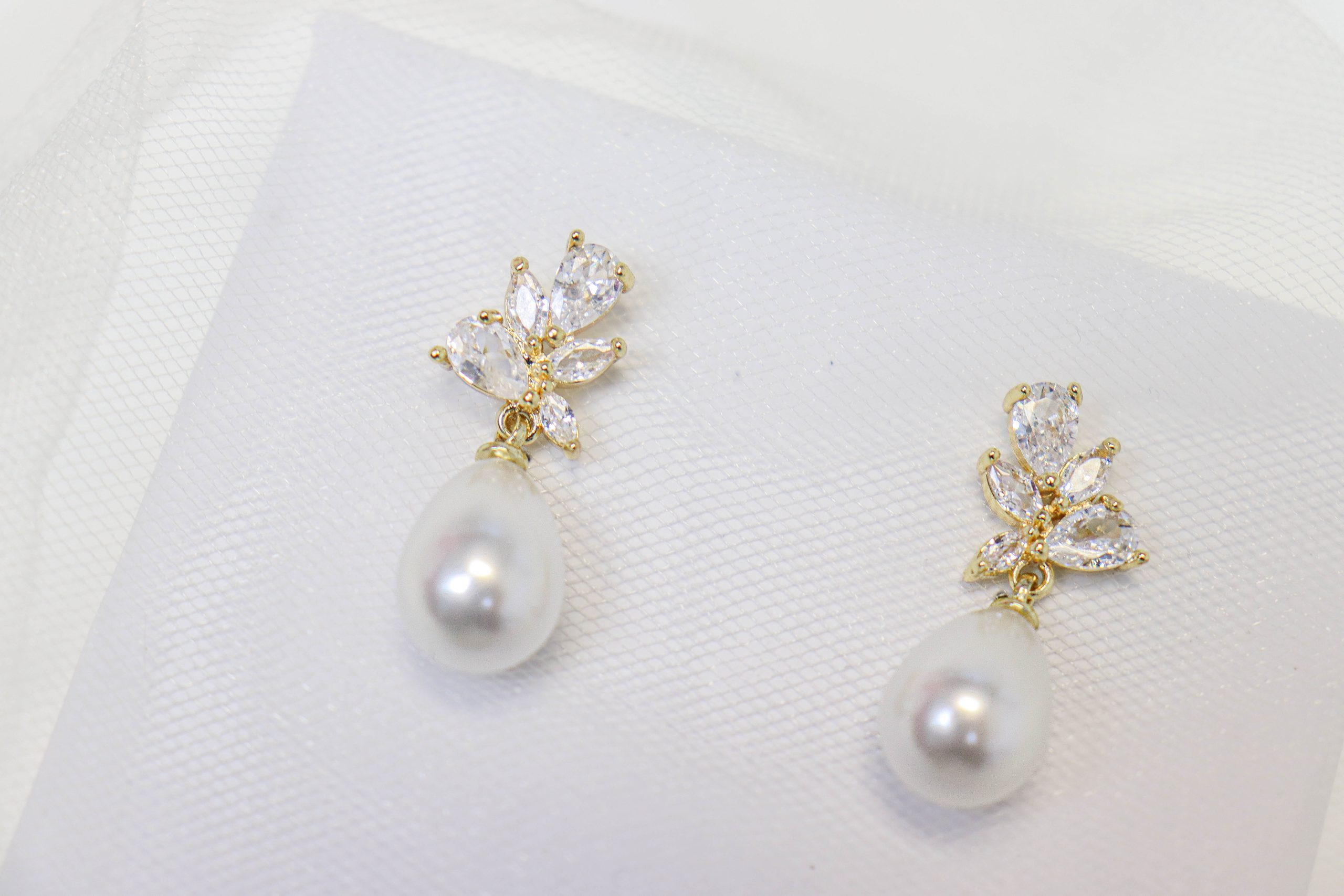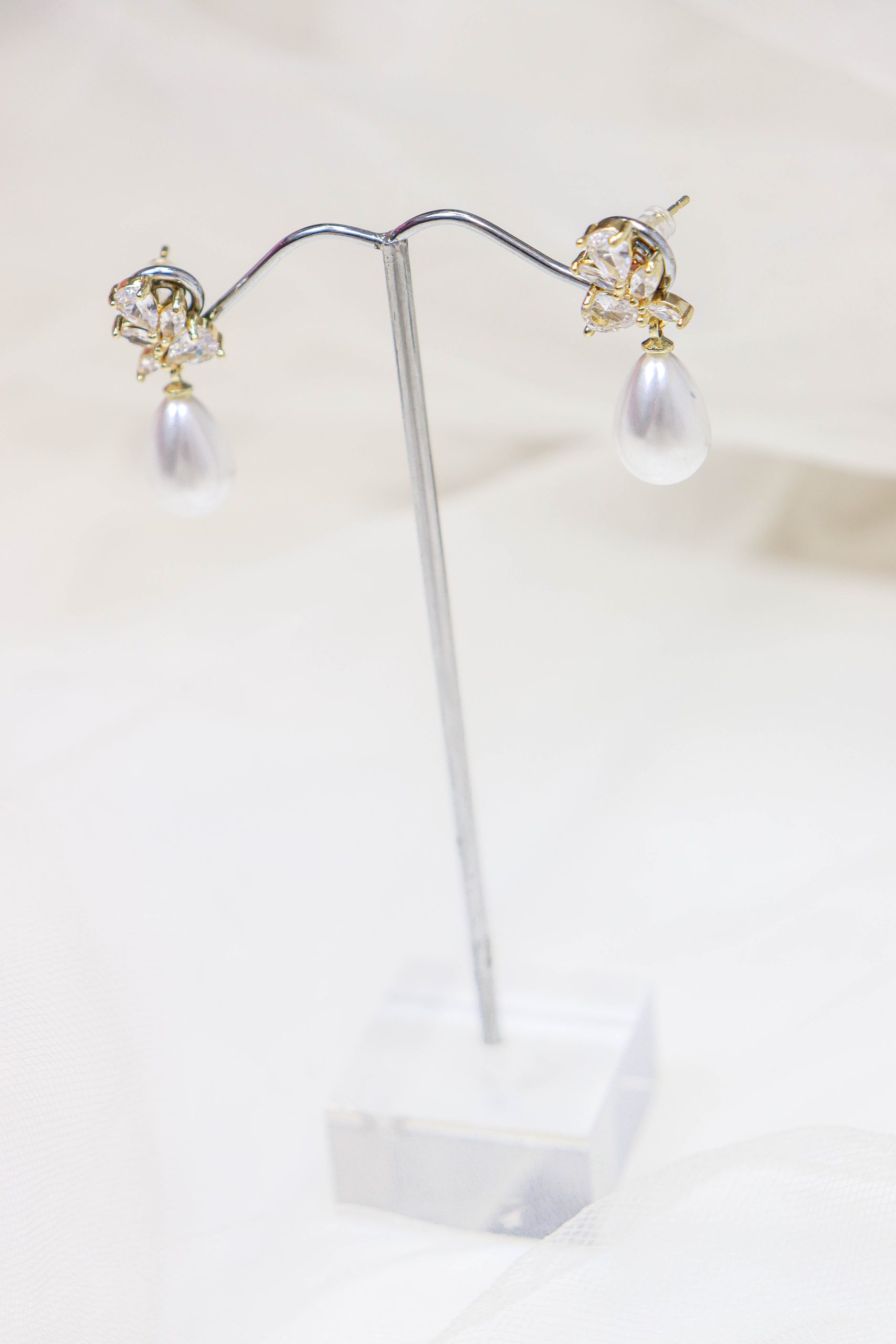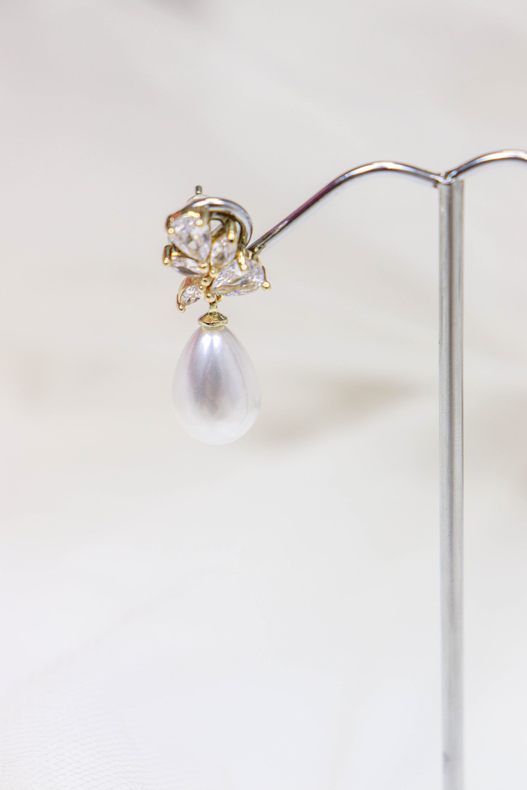Cubic Zirconia leaf with teardrop dangling pearl in color gold.