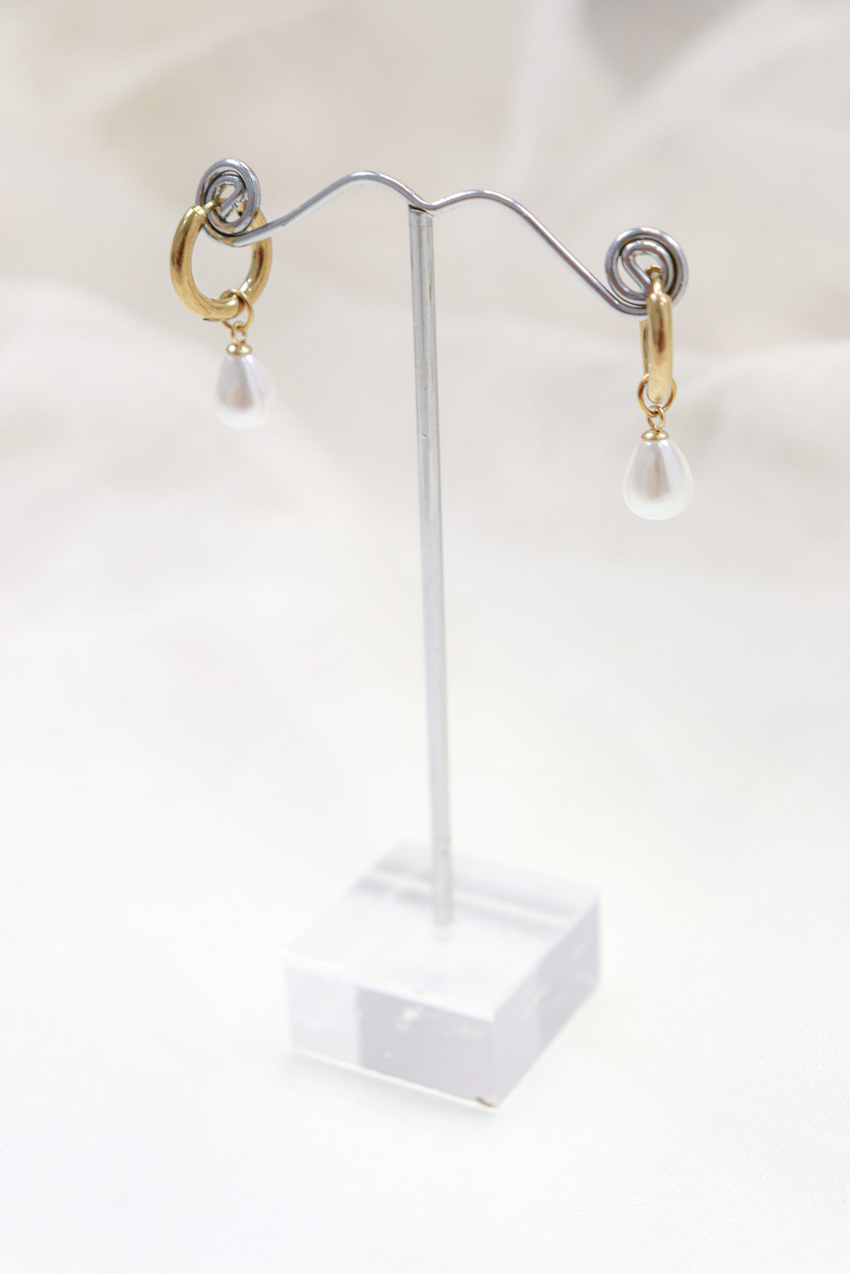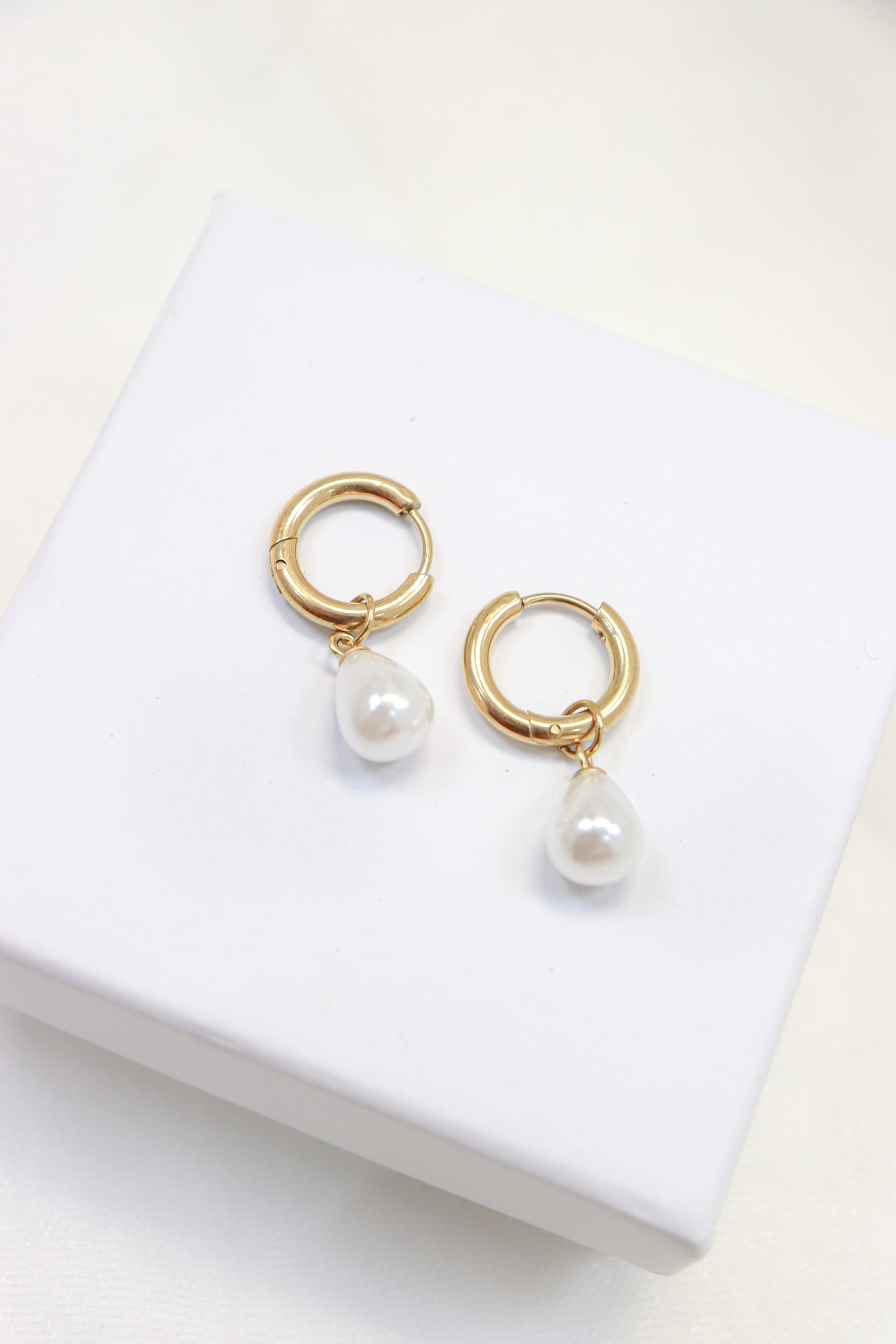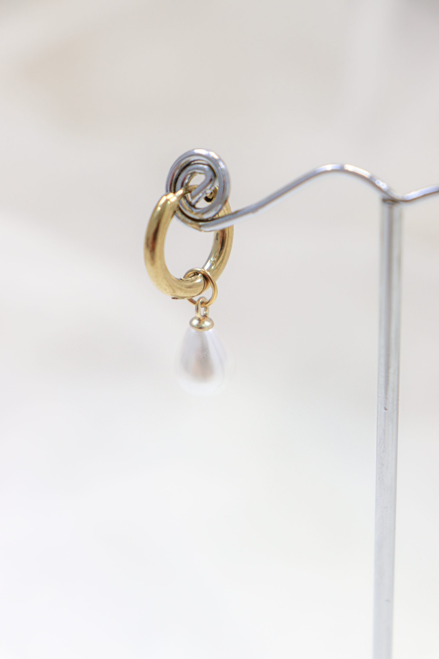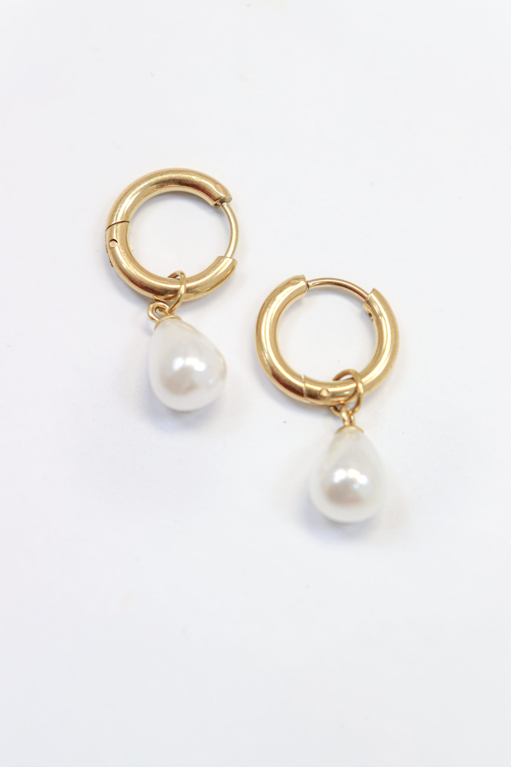 Gold earring hoop with dangling pearl in stainless steel.