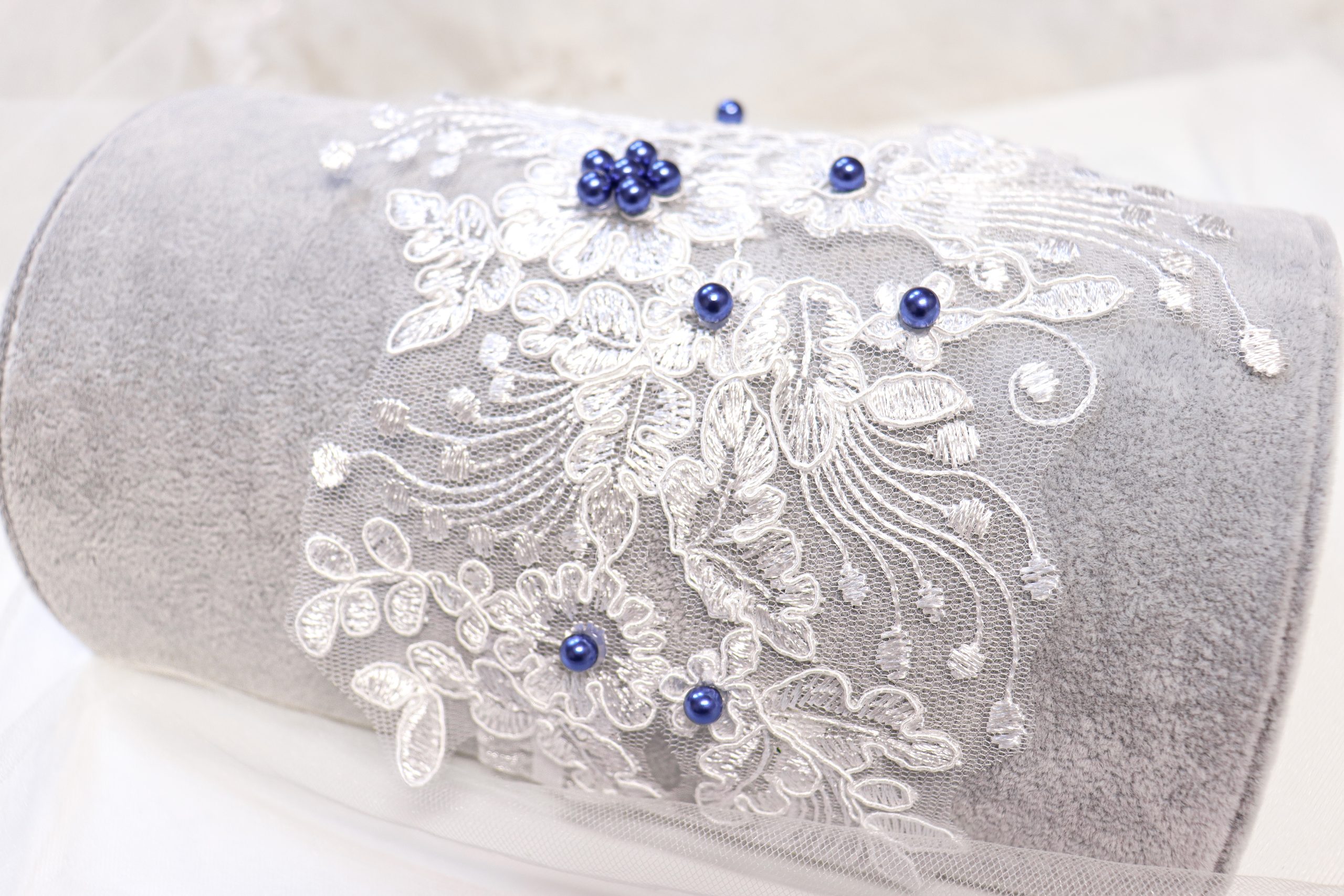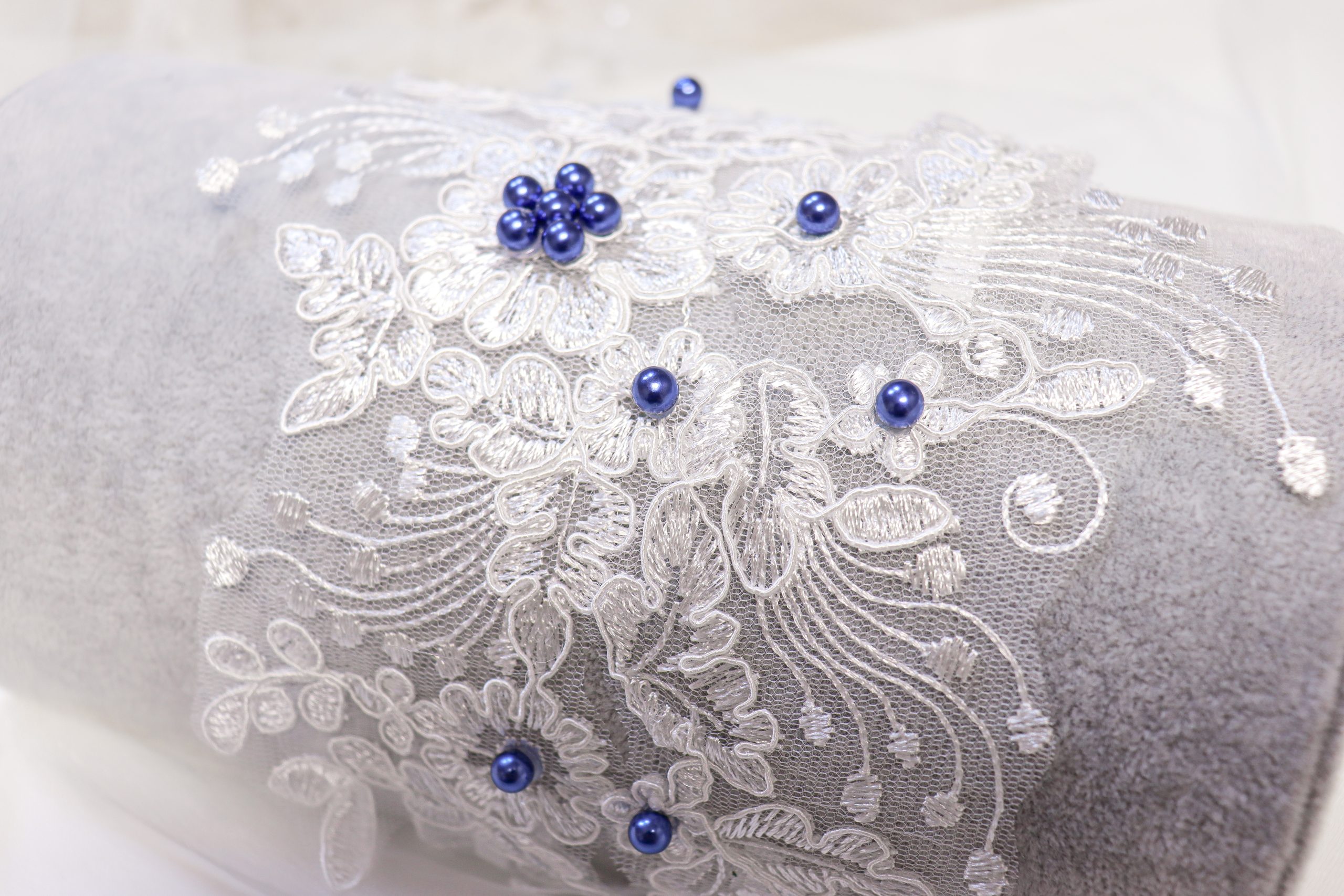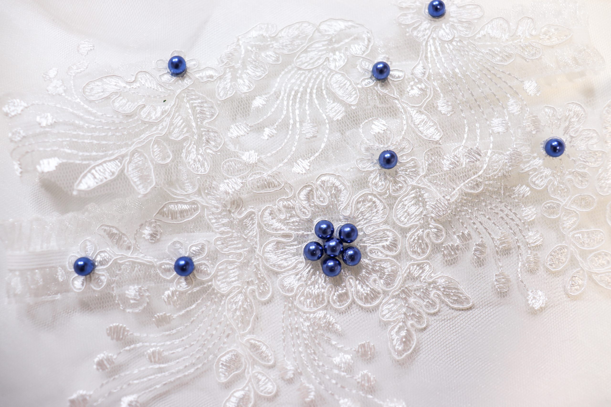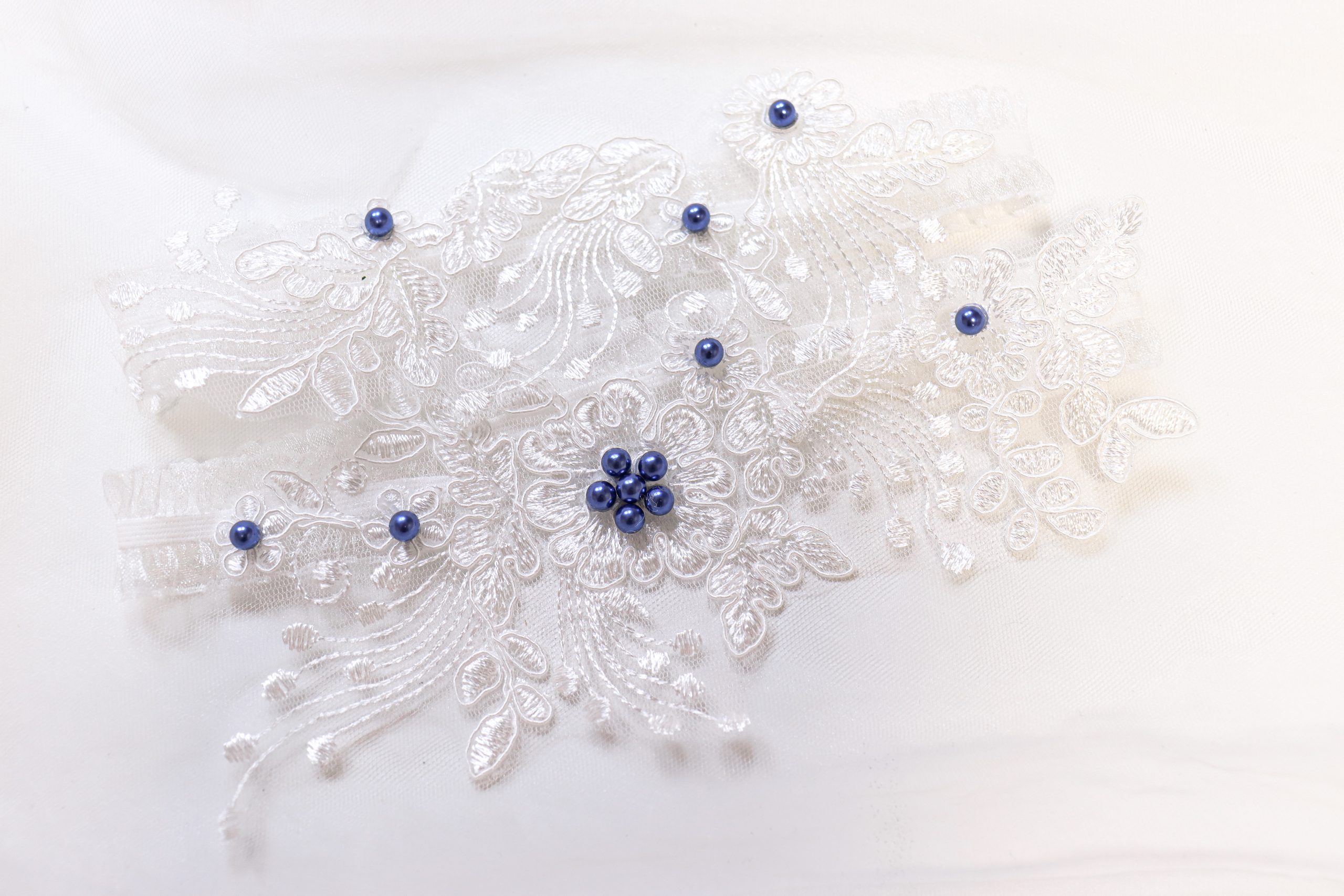 Two piece floral garter set decorated with minimal blue beads, ideal for your “something blue”!