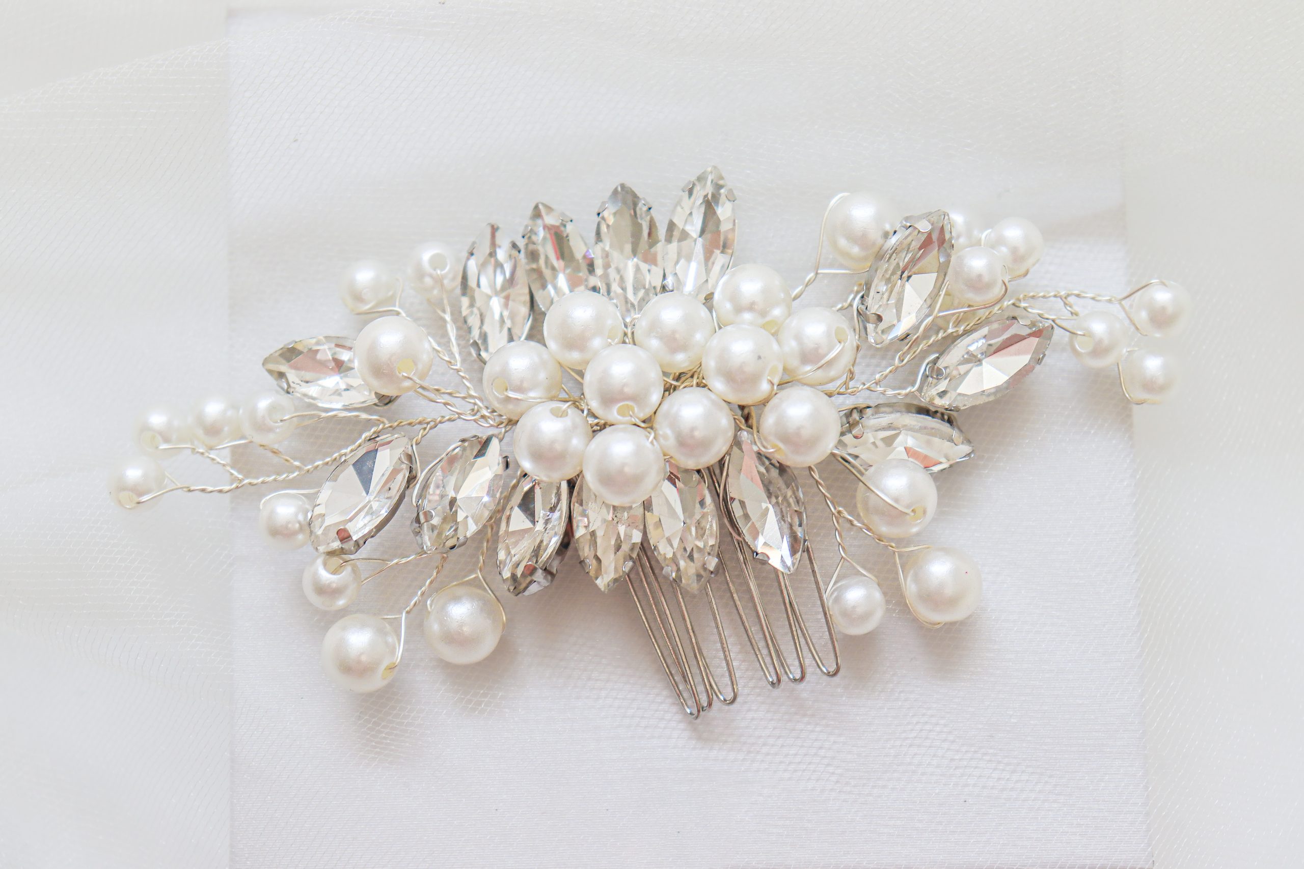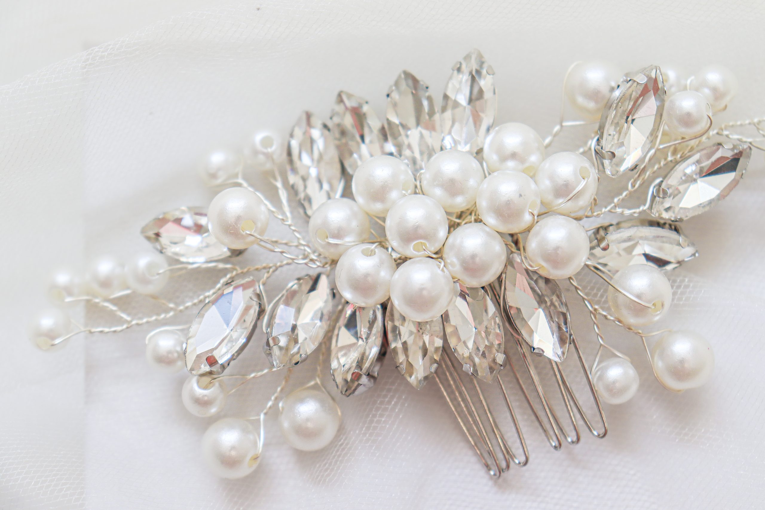 Faux pearl & rhinestone bridal comb in color silver.